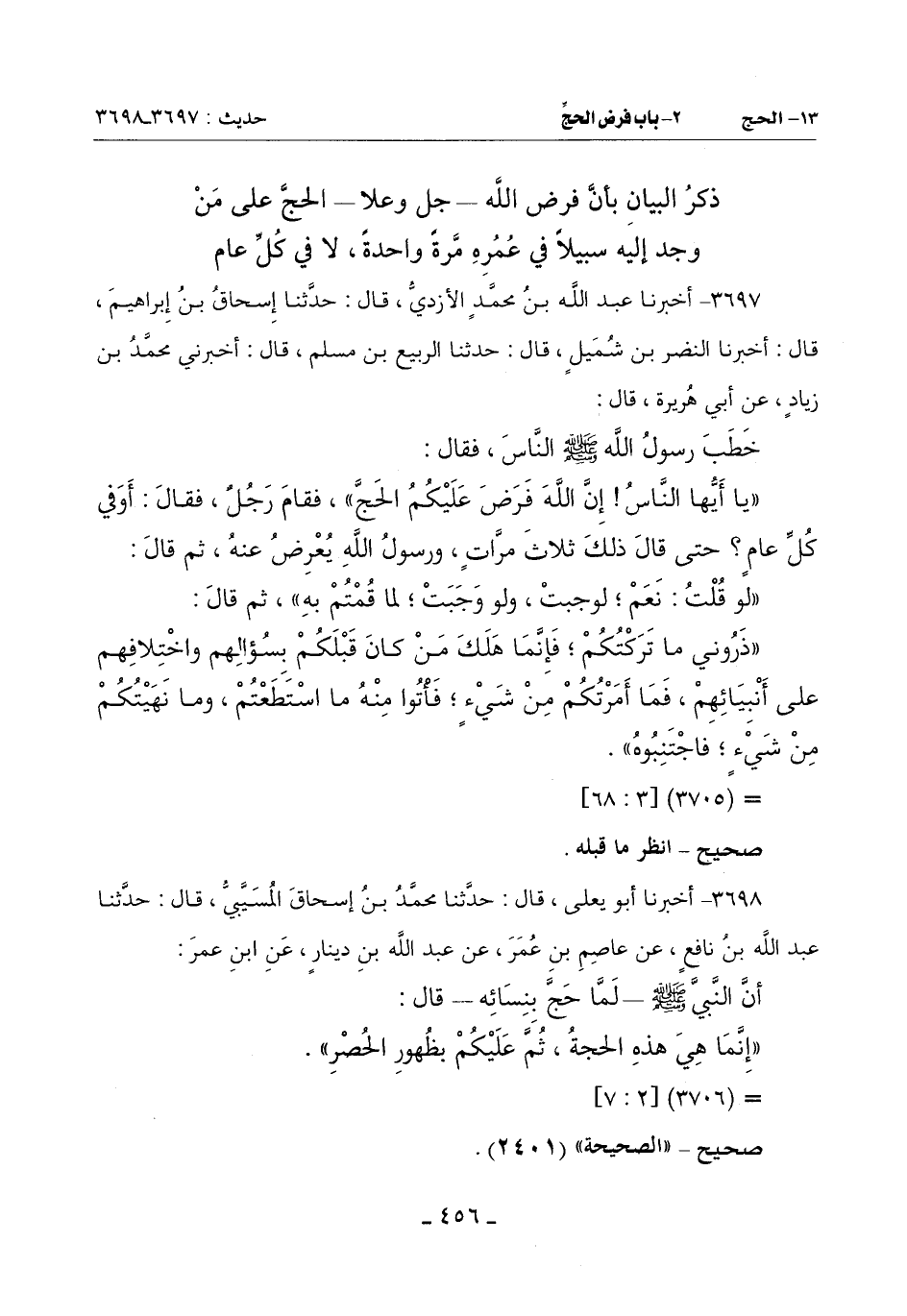ذِكْرُ الْبَيَانِ بِأَنَّ فَرْضَ اللَّهِ جَلَّ وَعَلَا الْحَجَّ عَلَى مَنْ وَجَدِ إِلَيْهِ سَبِيلًا فِي عُمْرِهِ مَرَّةً وَاحِدَةً لَا فِي كُلِّ عَامٍ