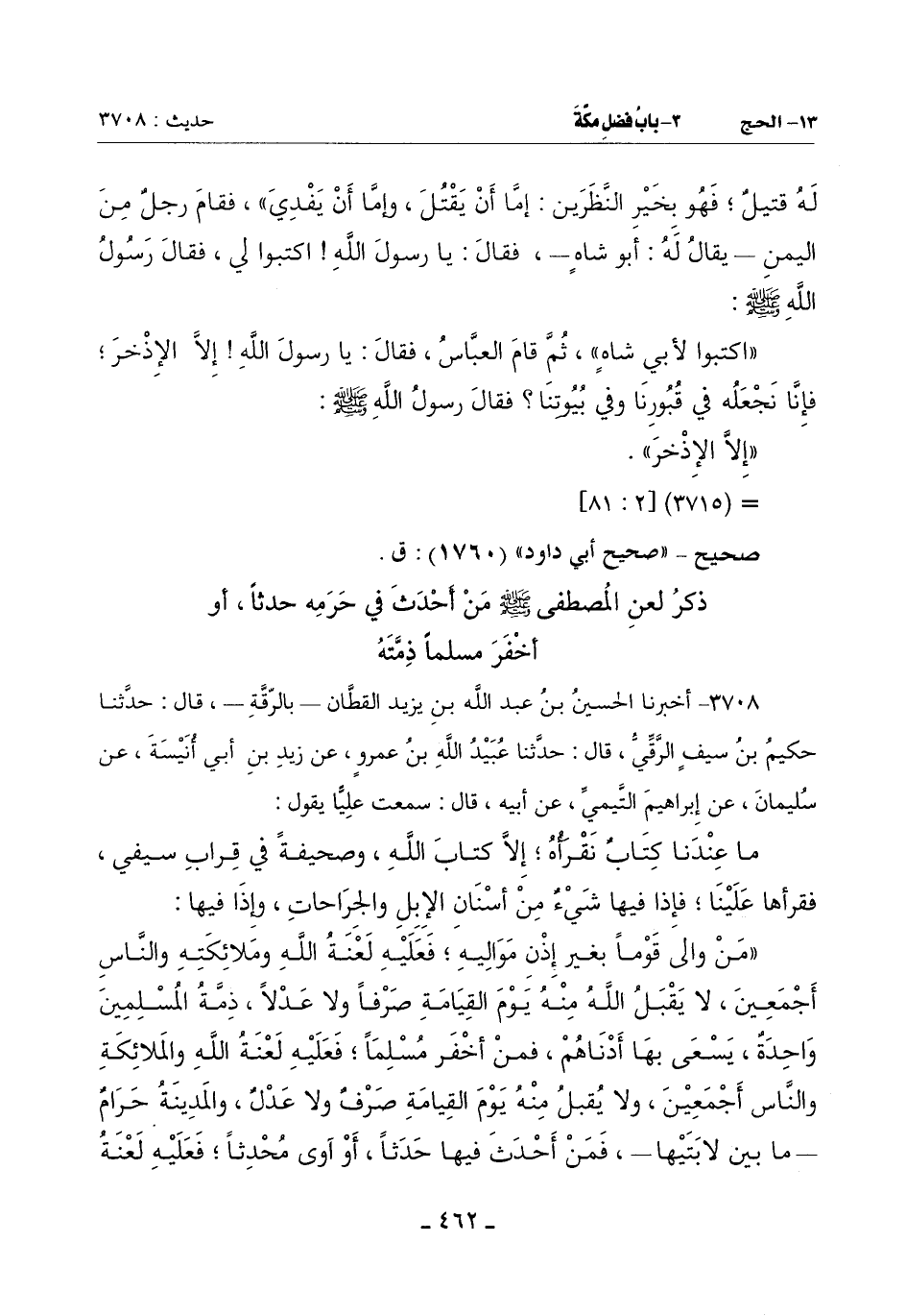 ذِكْرُ لَعْنِ الْمُصْطَفَى صَلَّى اللَّهُ عَلَيْهِ وَسَلَّمَ مَنْ أَحْدَثَ فِي حَرَمِه حَدَثًا أَوْ أَخْفَرَ مسلماً ذمته