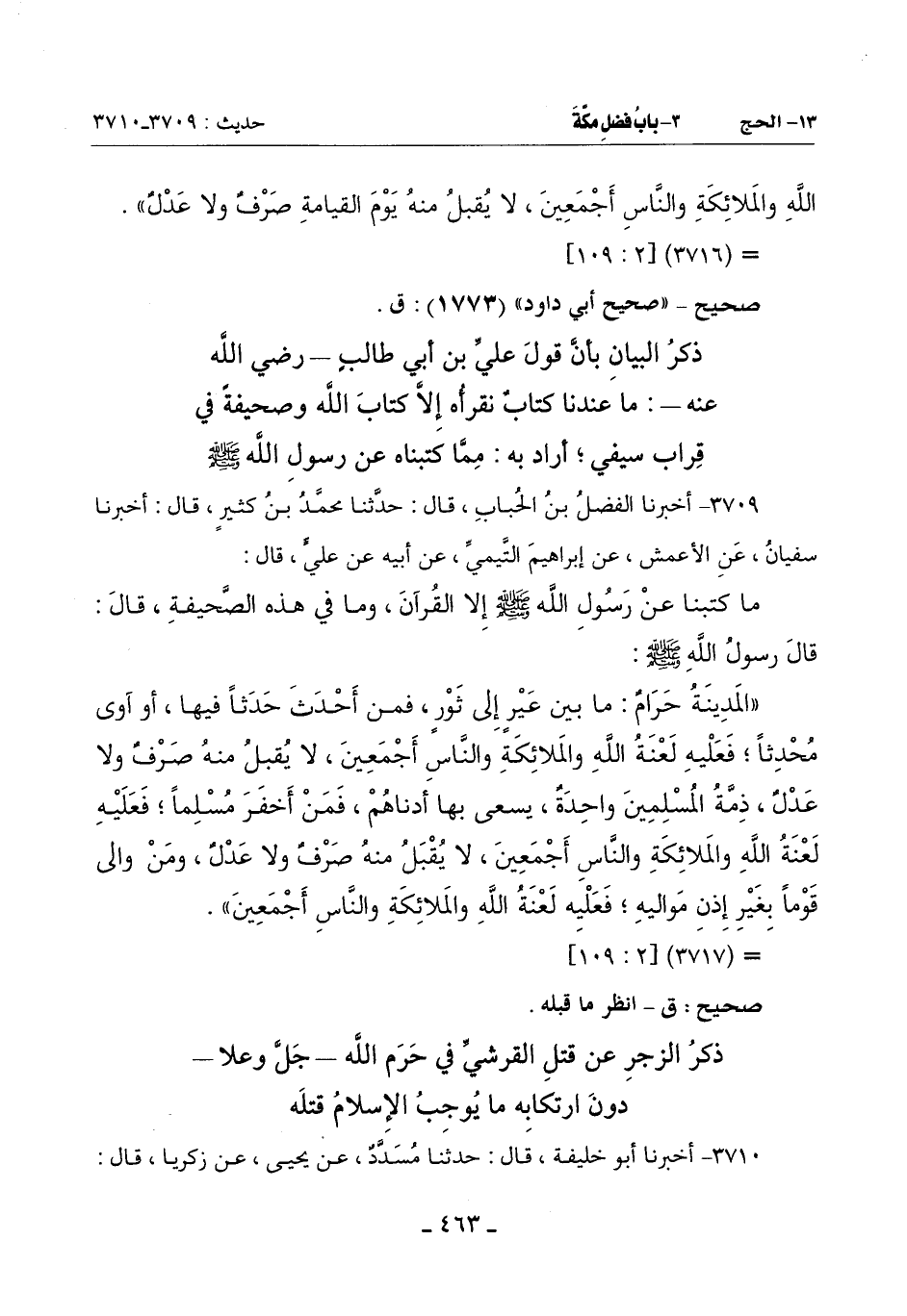 (الْمَدِينَةُ حَرَامٌ مَا بَيْنَ عَيْرٍ إِلَى ثَوْرٍ فَمَنْ أَحْدَثَ حَدَثًا فِيهَا أَوْ آوَى مُحْدِثاً فَعَلْيهِ لَعْنَةُ اللَّهِ وَالْمَلَائِكَةِ وَالنَّاسِ أَجْمَعِينَ لَا يُقبلُ مِنْهُ صرفٌ وَلَا عَدْلٌ ذِمَّةُ الْمُسْلِمِينَ وَاحِدَةٌ يَسْعَى بِهَا أَدْنَاهُمْ فَمَنْ أَخْفَرَ مُسْلِمًا فَعَلَيْهِ لَعْنَةُ اللَّهِ وَالْمَلَائِكَةِ وَالنَّاسِ أَجْمَعِينَ لَا يُقبَل مِنْهُ صَرْفٌ وَلَا عَدْلٌ وَمَنْ وَالَى قَوْمًا بِغَيْرِ إِذَنِ مَوَالِيهِ فَعَلَيْهِ لَعْنَةُ اللَّهِ وَالْمَلَائِكَةِ وَالنَّاسِ أَجْمَعِينَ)