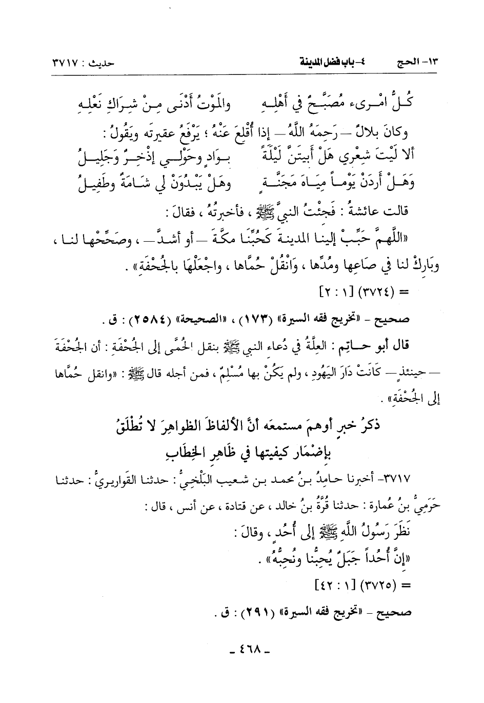 قَالَ أَبُو حَاتِمٍ: قَوْلُهُ صَلَّى اللَّهُ عَلَيْهِ وَسَلَّمَ: (جَبَلٌ يُحِبُّنَا وَنُحِبُّهُ) يُرِيدُ: أَهْلَ الْجَبَلِ كَقَوْلِهِ جَلَّ وَعَلَا: {وأُشْرِبُوا فِي قُلُوبِهِمُ الْعِجْلَ بِكُفْرِهِمْ} [البقرة: 93] يُرِيدُ حُبَّ الْعِجْلِ وَكَقَوْلِهِ جَلَّ وَعَلَا: {وَاسْأَلِ الْقَرْيَةَ} [يوسف: 82] يُرِيدُ بِهِ أَهْلَ الْقَرْيَةِ وَالْقَصْدُ فِيهِ: أَهْلُ الْمَدِينَةِ فَأَطْلَقَ رَسُولُ اللَّهِ صَلَّى اللَّهُ عَلَيْهِ وَسَلَّمَ خِطَابَ الْمَقْصُودِ بِهِ الْمَدِينَةَ عَلَى الْجَبَلِ الَّذِي هُوَ أُحُدٌ عَلَى سَبِيلِ الْمُقَارَبَةِ بَيْنَهُمَا وَالْمُجَاوَرَةِ