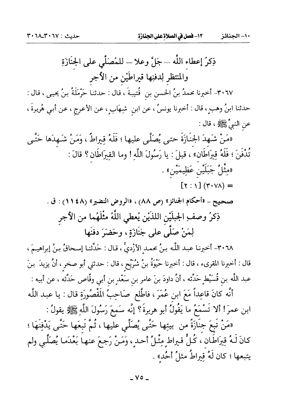(مَنْ تَبِعَ جَنَازَةً مِنْ بَيْتِهَا حَتَّى يُصَلِّيَ عَلَيْهَا ثُمَّ تَبِعَهَا حَتَّى يَدْفِنَهَا كَانَ لَهُ قِيرَاطَانِ كُلُّ قِيرَاطٍ مِثْلُ أُحُدٍ وَمَنْ رَجَعَ عَنْهَا بَعْدَمَا يُصَلِّي وَلَمْ يَتْبَعْهَا كَانَ لَهُ قِيرَاطٌ مِثْلُ أُحُدٍ) -[76]-