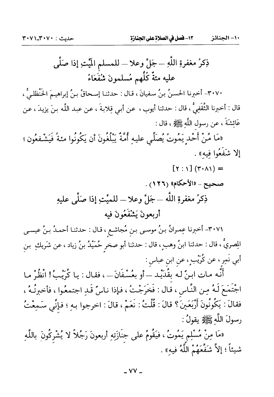 (مَا مِنْ مُسْلِمٍ يَمُوتُ فَيَقُومُ عَلَى جَنَازَتِهِ أَرْبَعُونَ رَجُلًا لَا يُشْرِكُونَ بِاللَّهِ شَيْئًا إِلَّا شَفَّعَهُمُ اللَّهُ فِيهِ) -[78]-