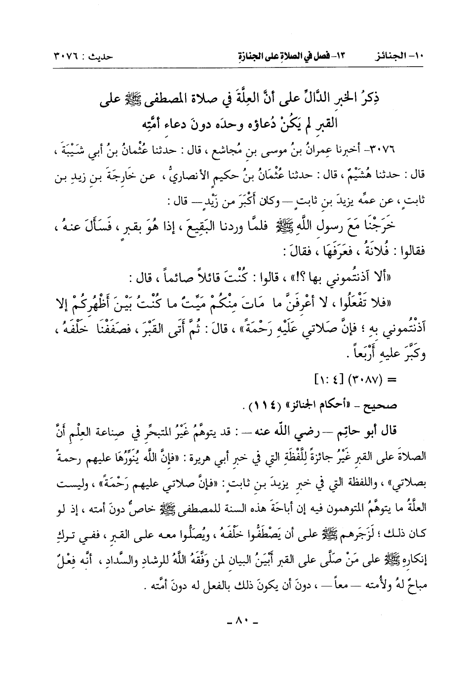 قَالَ أَبُو حَاتِمٍ ـ رَضِيَ اللَّهُ عَنْهُ ـ: قَدْ يَتَوَهَّمُ غَيْرَ الْمُتَبَحِّرِ فِي صِنَاعَةِ الْعِلْمِ أَنَّ الصَّلَاةَ عَلَى الْقَبْرِ غَيْرُ جَائِزَةٍ لِلَّفْظَةِ الَّتِي فِي خَبَرِ أَبِي هُرَيْرَةَ: (فَإِنَّ اللَّهَ يُنَوِّرُهَا عَلَيْهِمْ رَحْمَةً بِصَلَاتِي) وَاللَّفْظَةِ الَّتِي فِي خَبَرِ يَزِيدَ بْنِ ثَابِتٍ (فَإِنَّ صَلَاتِي عَلَيْهِمْ رَحْمَةٌ) وَلَيْسَتِ الْعِلَّةُ مَا يَتَوَهَّمُ الْمُتَوَهِّمُونَ فِيهِ أَنَّ إِبَاحَةَ هَذِهِ السُّنَّةِ لِلْمُصْطَفَى صَلَّى اللَّهُ عَلَيْهِ وسلم خاص دُونَ أُمَّتِهِ إِذْ لَوْ كَانَ ذَلِكَ لَزَجَرَهُمْ صَلَّى اللَّهُ عَلَيْهِ وَسَلَّمَ عَنْ أَنْ يَصْطَفُّوا خَلْفَهُ وَيُصَلُّوا مَعَهُ عَلَى الْقَبْرِ فَفِي تَرْكِ إِنْكَارِهِ صَلَّى اللَّهُ عَلَيْهِ وَسَلَّمَ عَلَى مَنْ صَلَّى عَلَى الْقَبْرِ أَبْيَنُ الْبَيَانِ لِمَنْ وَفَّقَهُ اللَّهُ لِلْرَشَادِ وَالسَّدَادِ أَنَّهُ فِعْلٌ مُبَاحٌ لَهُ وَلِأُمَّتِهِ مَعًا دُونَ أَنْ يَكُونَ ذَلِكَ بِالْفِعْلِ لَهُمْ دُونَ أُمَّتِهِ