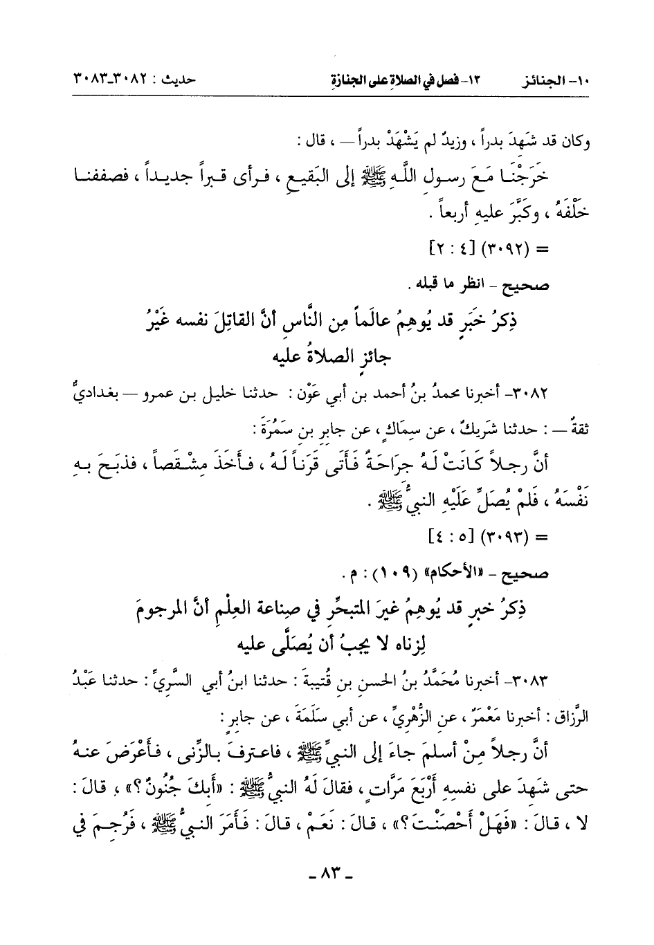 أَنَّ رَجُلًا كَانَتْ لَهُ جِرَاحَةٌ فَأَتَى قَرْنًا لَهُ فَأَخَذَ مِشْقَصًا فَذَبَحَ بِهِ نَفْسَهُ فَلَمْ يُصَلِّ عَلَيْهِ النَّبِيُّ صَلَّى اللَّهُ عَلَيْهِ وَسَلَّمَ