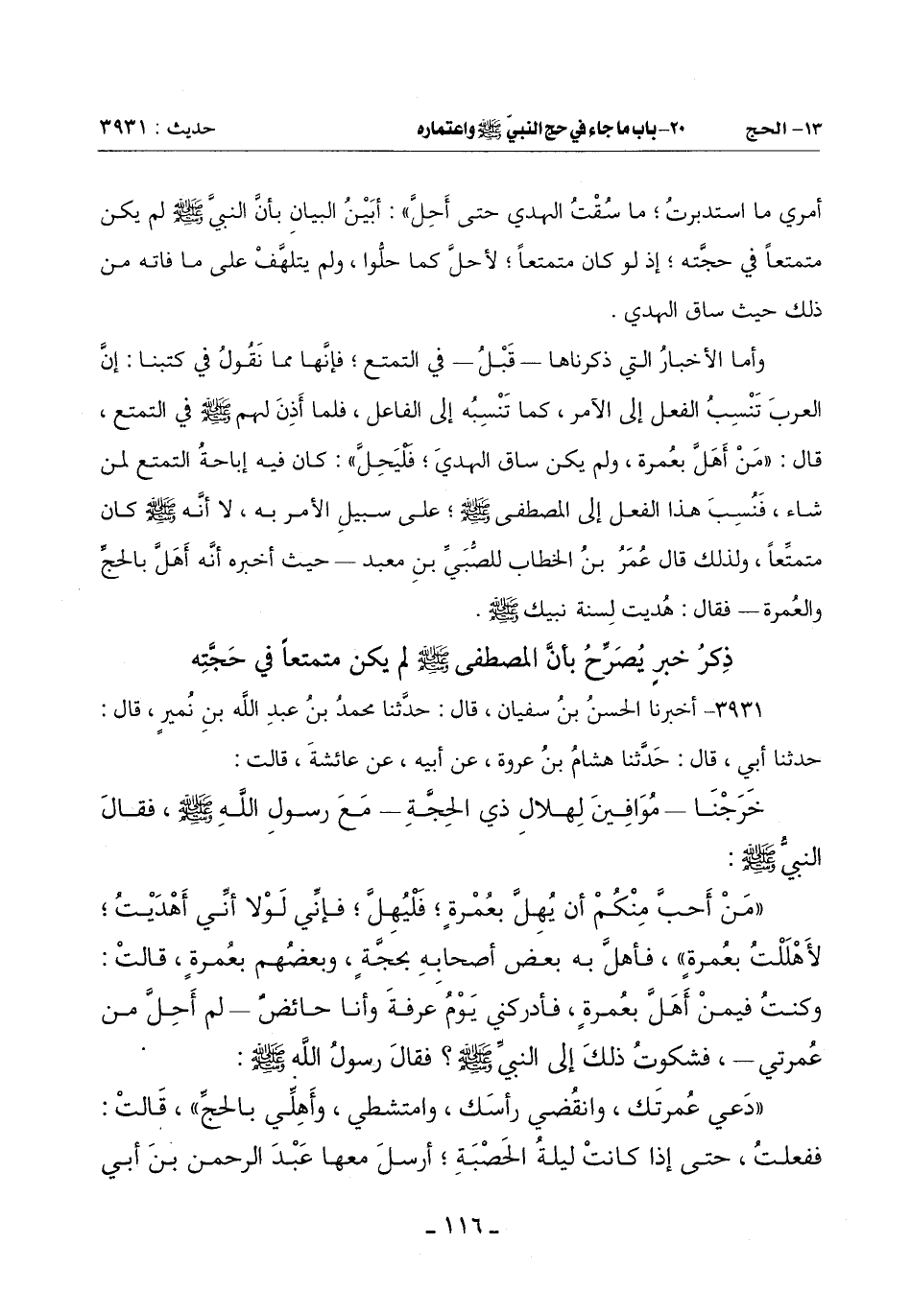 3931 - أَخْبَرَنَا الْحَسَنُ بْنُ سُفْيَانَ قَالَ: حَدَّثَنَا مُحَمَّدُ بْنُ عَبْدِ اللَّهِ بْنِ نُمَيْرٍ قَالَ: حَدَّثَنَا أَبِي قَالَ: حَدَّثَنَا هِشَامُ بْنُ عُرْوَةَ عَنْ أَبِيهِ عَنْ عَائِشَةَ قَالَتْ: