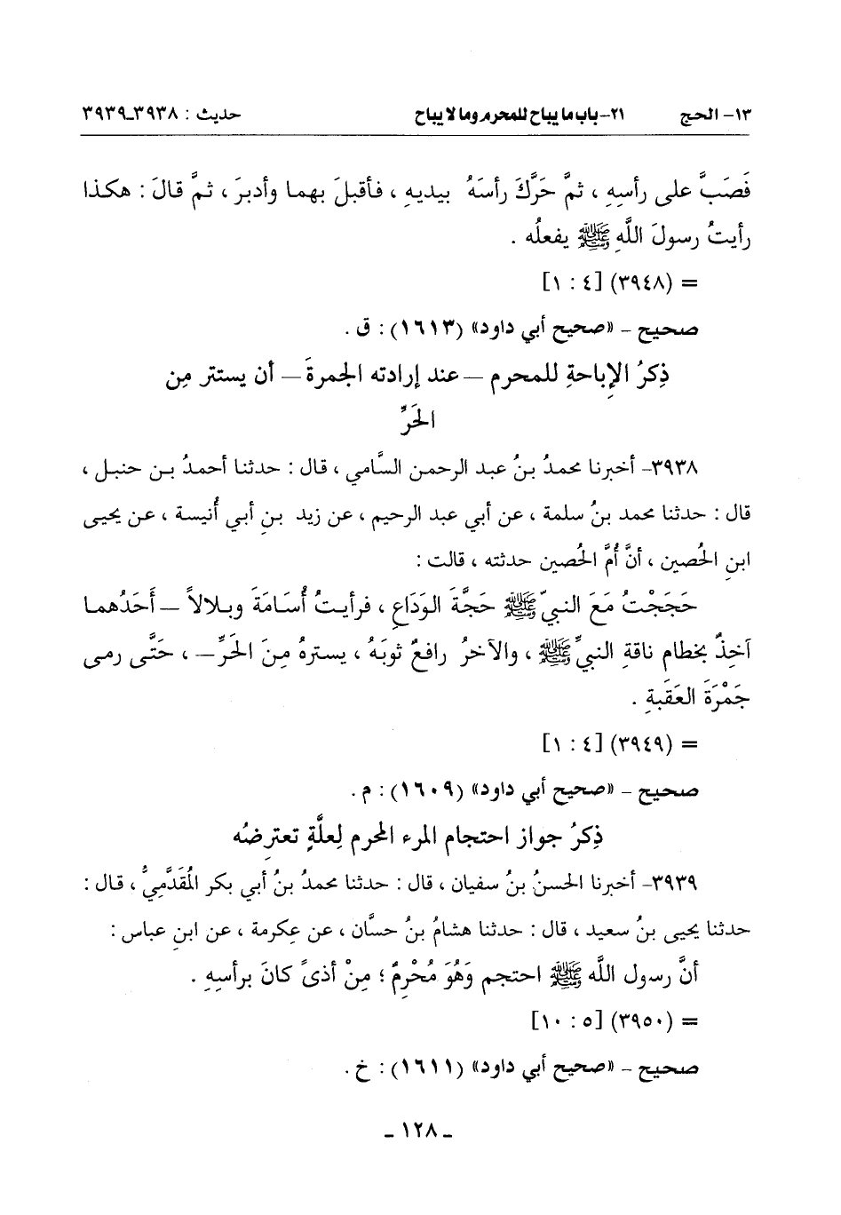 3938 - أخبرنا محمد بن الرَّحْمَنِ السَّامِيُّ قَالَ: حَدَّثَنَا أَحْمَدُ بْنُ حَنْبَلٍ قَالَ حَدَّثَنَا مُحَمَّدُ بْنُ سَلَمَةَ عَنْ أَبِي عَبْدِ الرَّحِيمِ عَنْ زَيْدِ بْنِ أَبِي أُنَيْسَةَ عَنْ يَحْيَى بْنِ الْحُصَيْنِ أَنَّ أُمَّ الْحُصَيْنِ حَدَّثَتْهُ قَالَتْ: