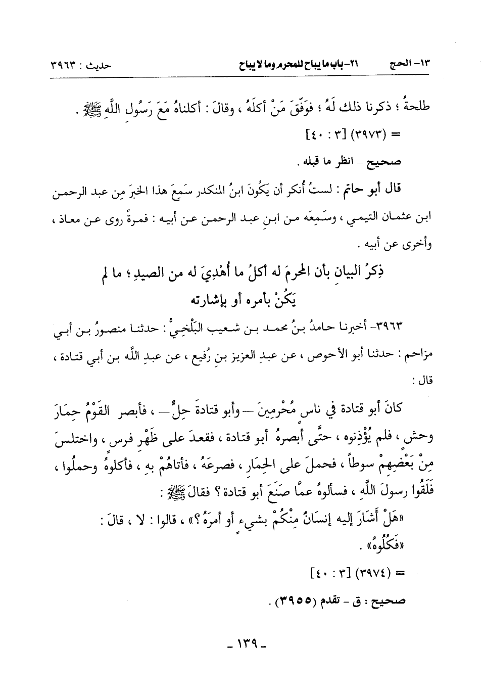 3963 - أَخْبَرَنَا حَامِدُ بْنُ مُحَمَّدِ بْنِ شُعَيْبٍ الْبَلْخِيُّ حدثنا منصور ابن أَبِي مُزَاحِمٍ حَدَّثَنَا أَبُو الْأَحْوَصِ عَنْ عَبْدِ الْعَزِيزِ بْنِ رُفَيْعٍ: عَنْ عَبْدِ اللَّهِ بْنِ أَبِي قَتَادَةَ قَالَ: