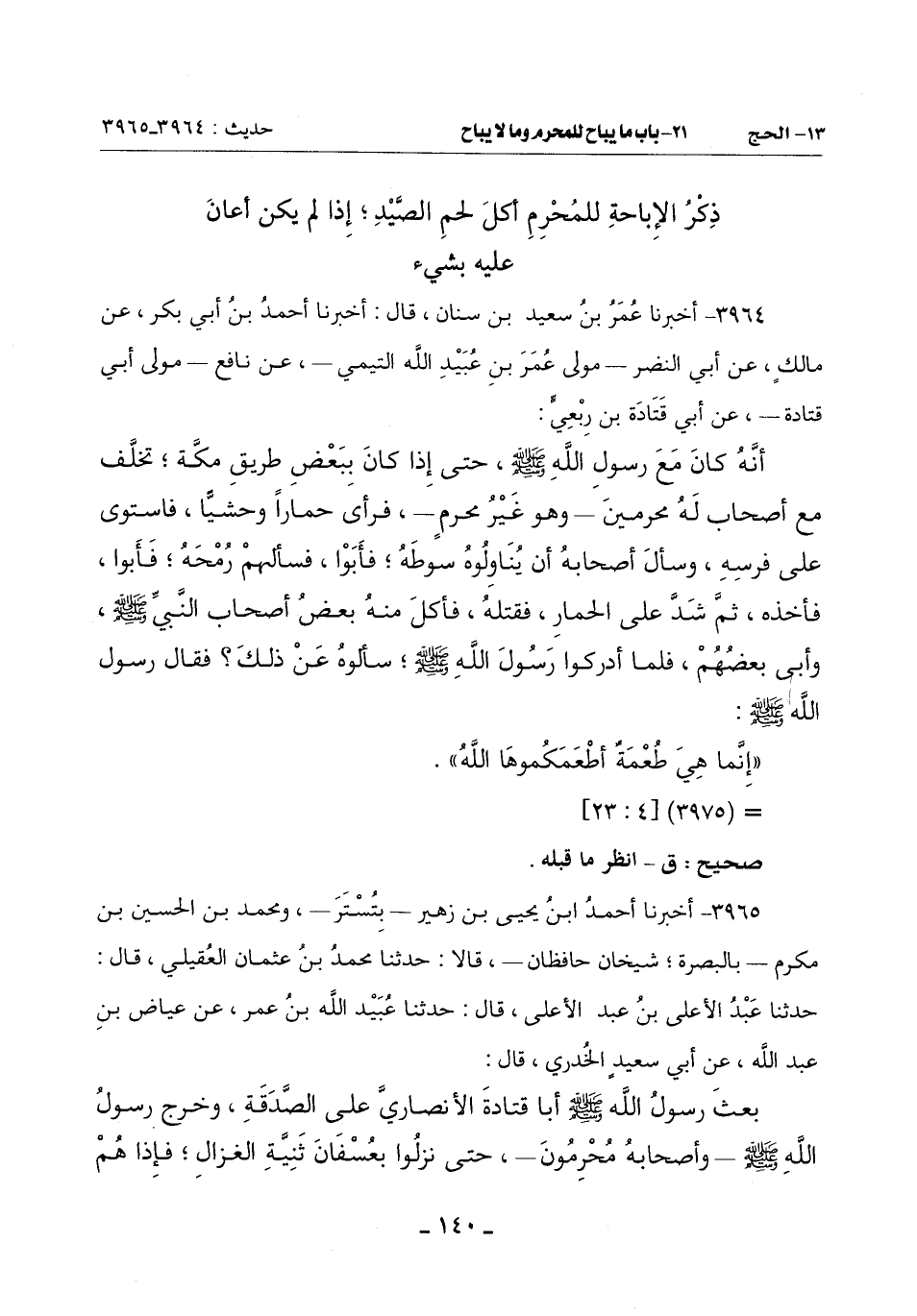 بَعَثَ رَسُولُ اللَّهِ صَلَّى اللَّهُ عَلَيْهِ وَسَلَّمَ أَبَا قَتَادَةَ الْأَنْصَارِيَّ عَلَى الصَّدَقَةَ وَخَرَجَ رَسُولُ اللَّهِ صَلَّى اللَّهُ عَلَيْهِ وَسَلَّمَ وَأَصْحَابُهُ مُحْرِمُونَ حَتَّى نَزَلُوا بِعُسْفَانَ ثَنِيَّةِ الْغَزَّالِ فَإِذَا هُمْ -[141]- بِحِمَارٍ وَحْشِيٍّ فَجَاءَ أَبُو قَتَادَةَ وَهُوَ حِلٌّ فَنَكَّسُوا رؤوسهم كَرَاهِيَةَ أَنْ يُحِدُّوا أَبْصَارَهُمْ فَيَفْطَنَ فَرَآهُ فَرَكِبَ فَرَسَهُ وَأَخَذَ الرُّمْحَ فَسَقَطَ مِنْهُ السَّوْطُ فَقَالَ: نَاوِلْنِيهِ فَقُلْنَا: لَا نُعِينُكَ عَلَيْهِ بِشَيْءٍ فَحَمَلَ عَلَيْهِ فَعَقَرَهُ قَالَ ثُمَّ جَعَلُوا يَشْوُونَ مِنْهُ ثُمَّ قَالُوا: رَسُولُ اللَّهِ صَلَّى اللَّهُ عَلَيْهِ وَسَلَّمَ بَيْنَ أَظْهُرِنَا - وَكَانَ تقدَّمَهُم - فَأَتَوْهُ فَسَأَلُوهُ فَلَمْ يَرَ بِهِ بَأْسًا وَأَظُنُّهُ قَالَ: