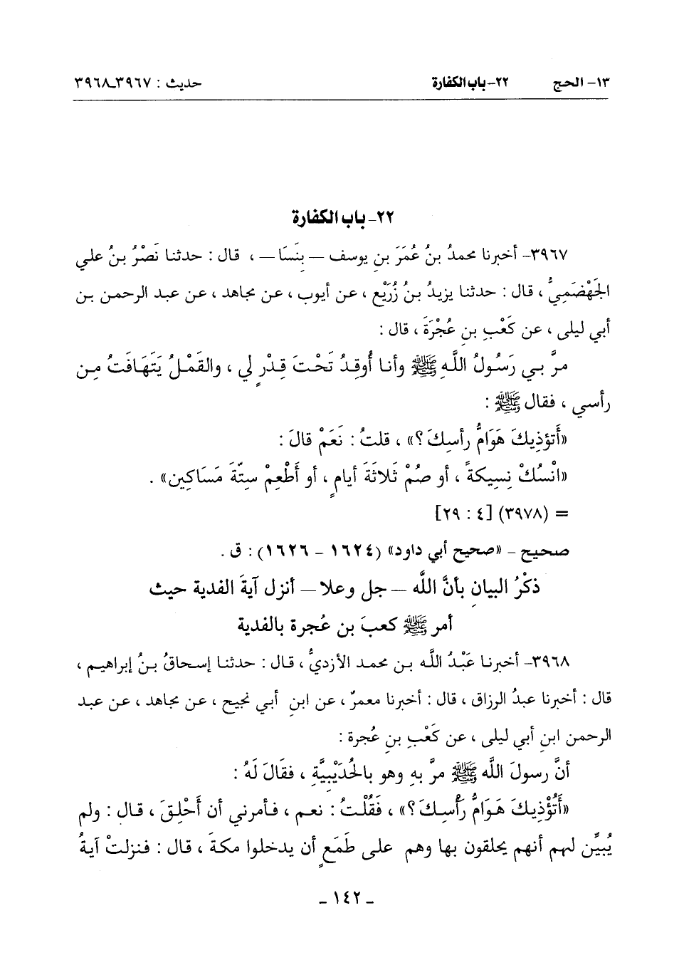 3967 - أَخْبَرَنَا مُحَمَّدُ بْنُ عُمَرَ بْنِ يُوسُفَ بِنَسَا قَالَ: حَدَّثَنَا نَصْرُ بْنُ عَلِيٍّ الْجَهْضَمِيُّ قَالَ: حَدَّثَنَا يَزِيدُ بْنُ زُرَيْعٍ عَنْ أَيُّوبَ عَنْ مُجَاهِدٍ عَنْ عَبْدِ الرَّحْمَنِ بْنِ أَبِي لَيْلَى عَنْ كَعْبِ بْنِ عُجْرَةَ قَالَ: