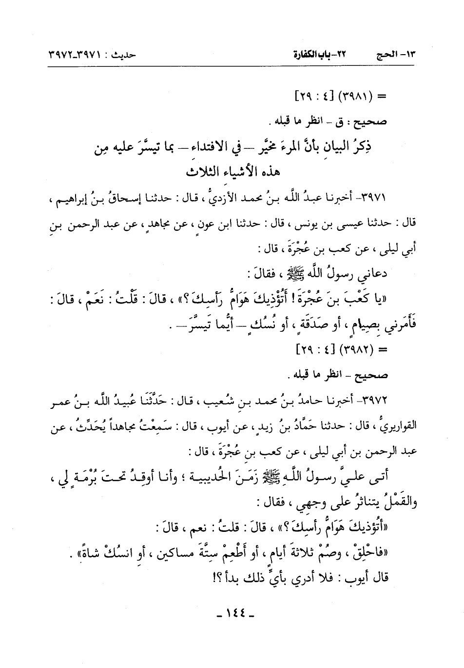(يَا كَعْبُ بْنَ عُجْرَةَ أَتُؤْذِيكَ هَوَامُّ رَأْسِكَ؟ ) قَالَ: قُلْتُ: نَعَمْ قَالَ: فَأَمَرَنِي بِصِيَامٍ أَوْ صَدَقَةٍ أو نسك ـ أيُّما تَيسَّر ـ.
