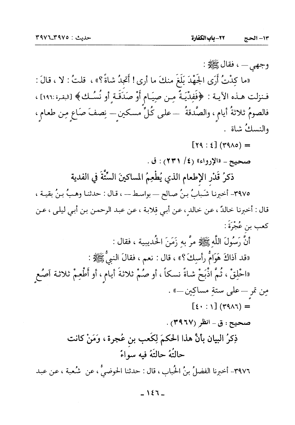 (احْلِقْ ثُمَّ اذْبَحْ شَاةً نُسُكًا أَوْ صُمْ ثَلَاثَةَ أَيَّامٍ أَوْ أَطْعِمْ ثَلَاثَةَ آصُعٍ مِنْ تَمْرٍ ـ عَلَى سِتَّةِ مَسَاكِينَ ـ)
