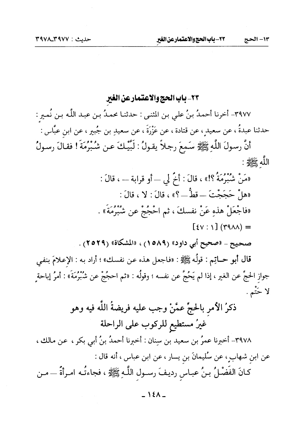 قَالَ أَبُو حَاتِمٍ: قَوْلُهُ صَلَّى اللَّهُ عَلَيْهِ وَسَلَّمَ: (فَاجْعَلْ هَذِهِ عَنْ نَفْسِكَ) أَرَادَ بِهِ الْإِعْلَامَ بِنَفْيِ جَوَازِ الْحَجِّ عَنِ الْغَيْرِ إِذَا لَمْ يَحُجَّ عَنْ نَفْسِهِ وَقَوْلُهُ: (ثُمَّ احْجُجْ عَنْ شُبْرُمَةَ) أَمْرُ إِبَاحَةٍ لَا حَتْمٍ