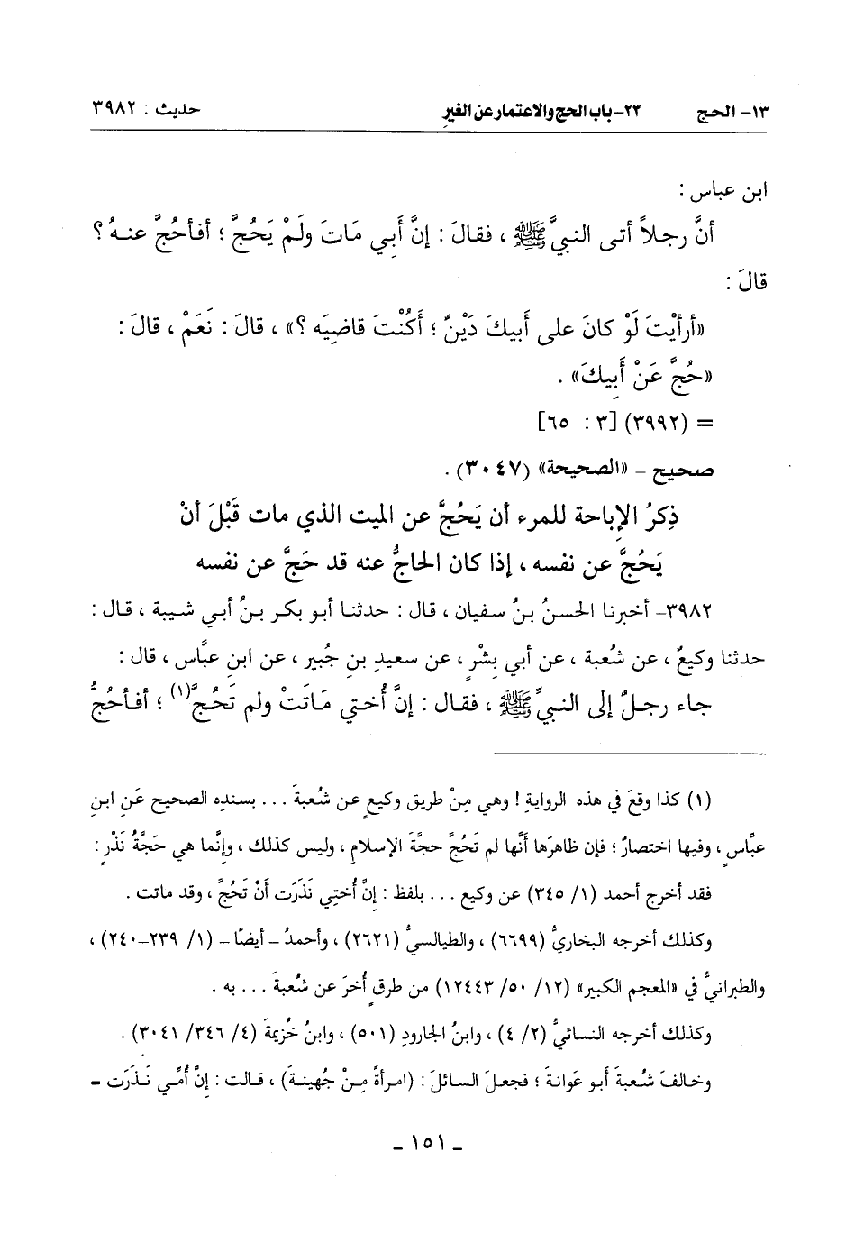 جَاءَ رَجُلٌ إِلَى النَّبِيِّ صَلَّى اللَّهُ عَلَيْهِ وَسَلَّمَ فَقَالَ: إِنَّ أُخْتِي مَاتَتْ وَلَمْ تَحُجَّ (¬1) أَفَأَحُجُّ -[152]- عَنْهَا؟ فَقَالَ صَلَّى اللَّهُ عَلَيْهِ وَسَلَّمَ: