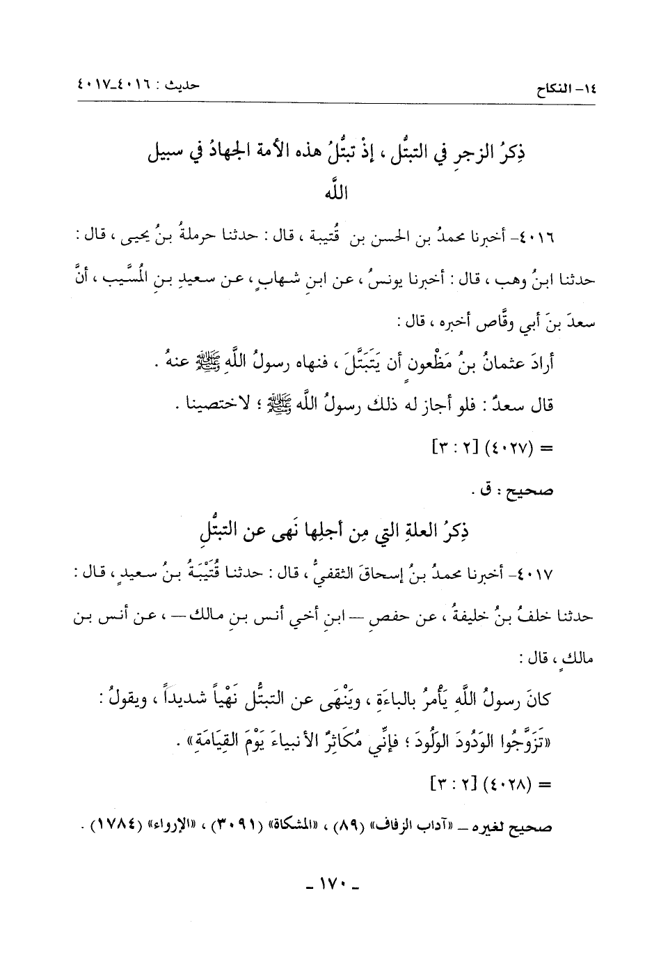 أَرَادَ عُثْمَانُ بْنُ مَظْعُونٍ أَنْ يَتَبَتَّلَ فَنَهَاهُ رَسُولُ اللَّهِ صَلَّى اللَّهُ عَلَيْهِ وَسَلَّمَ عَنْهُ.