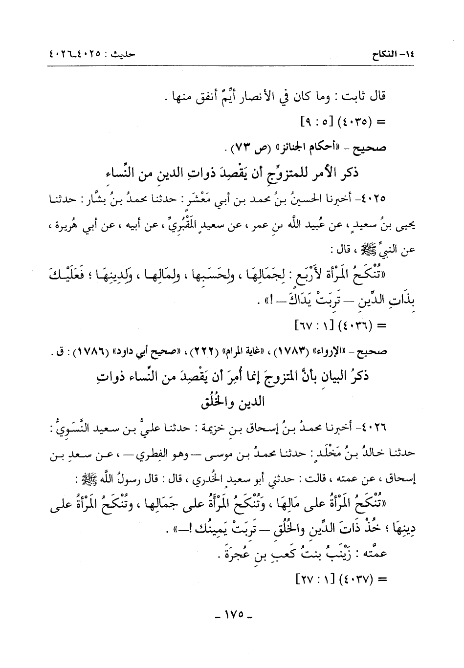 (تُنكح الْمَرْأَةُ عَلَى مَالِهَا وَتُنْكَحُ الْمَرْأَةُ عَلَى جَمَالِهَا وَتُنْكَحُ الْمَرْأَةُ عَلَى دِينِهَا خُذْ ذَاتَ الدِّينِ وَالْخُلُقِ تَرِبَتْ يَمِينُكَ)