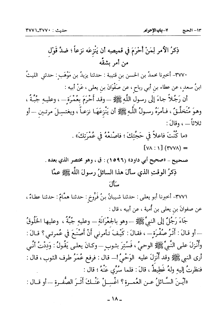 3770 - أَخْبَرَنَا مُحَمَّدُ بْنُ الْحَسَنِ بْنِ قُتَيْبَةَ حَدَّثَنَا يَزِيدُ بْنُ مَوْهَبٍ حَدَّثَنِي اللَّيْثُ بْنُ سَعْدٍ عَنْ عَطَاءِ بْنِ أَبِي رَبَاحٍ عَنْ صَفْوَانَ بْنِ يَعْلَى عَنْ أَبِيهِ: