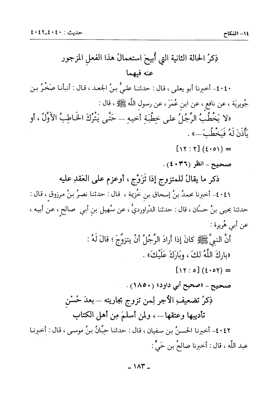 4042 - أَخْبَرَنَا الْحَسَنُ بْنُ سُفْيَانَ قَالَ: حَدَّثَنَا حِبَّانُ بْنُ مُوسَى قَالَ: أَخْبَرَنَا عَبْدُ اللَّهِ قَالَ: أَخْبَرَنَا صَالِحُ بْنُ حَيٍّ: -[184]-