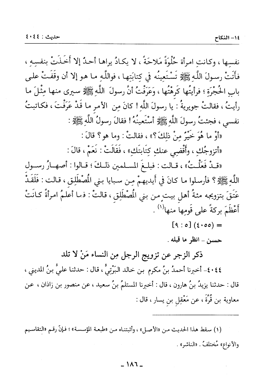 (¬1) سقط هذا الحديث من ((الأصل)) , وأثبتناه من ((طبعة المؤسسة))؛ فإن رقم ((التقاسيم والأنواع)) مختلف. ((الناشر)).