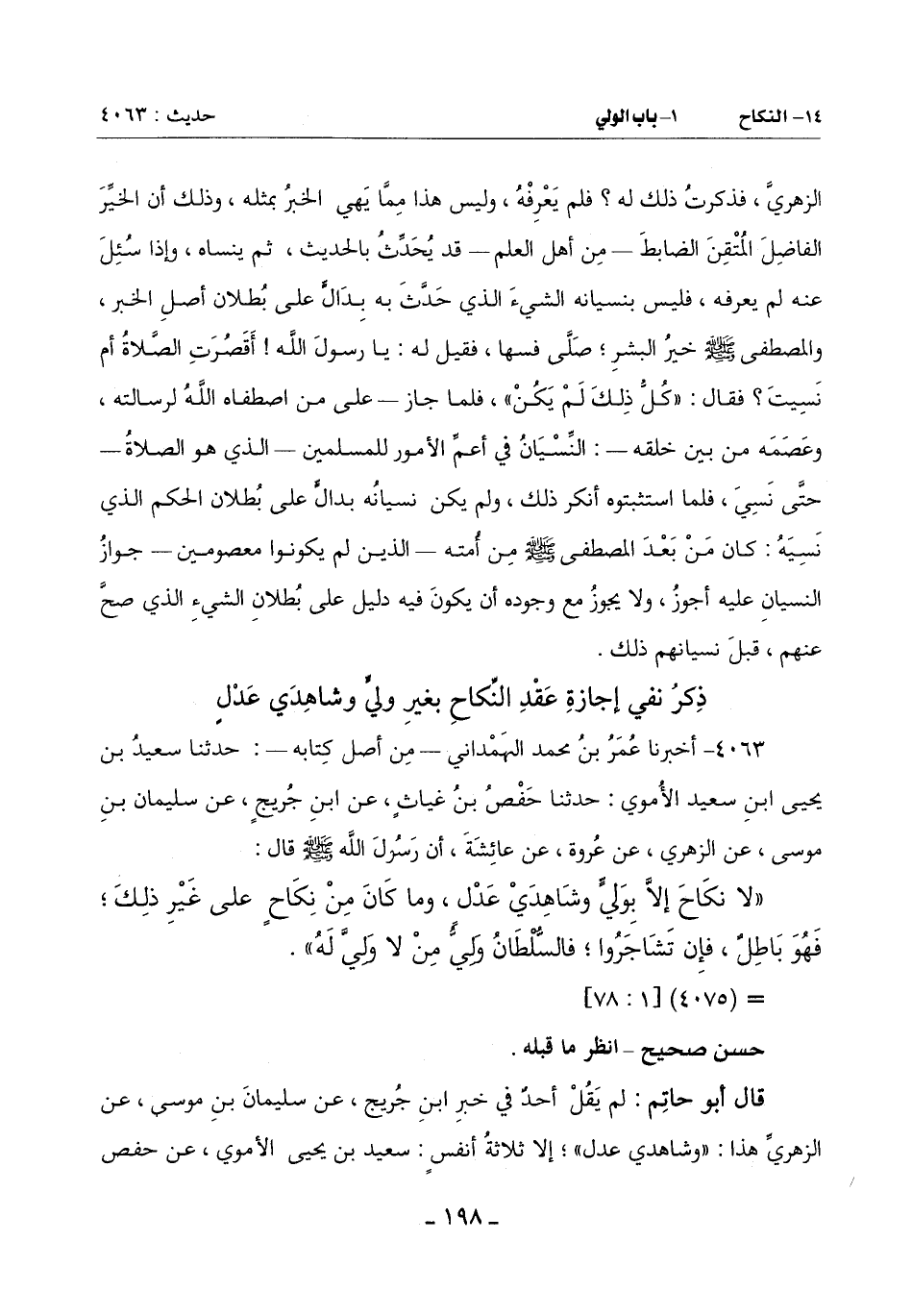 قَالَ أَبُو حَاتِمٍ: لَمْ يَقُلْ أَحَدٌ فِي خَبَرِ ابْنِ جُرَيْجٍ عَنْ سُلَيْمَانَ بْنِ مُوسَى عَنِ الزُّهْرِيِّ هَذَا (وَشَاهِدَيْ عَدْلٍ) إِلَّا ثَلَاثَةُ أَنْفَسٍ: سَعِيدُ بْنُ يَحْيَى الْأُمَوِيُّ عَنْ حَفْصِ -[199]- بْنِ غِيَاثٍ وَعَبْدُ اللَّهِ بْنُ عَبْدِ الْوَهَّابِ الْحَجَبِيُّ عَنْ خَالِدِ بْنِ الْحَارِثِ وَعَبْدُ الرَّحْمَنِ بْنِ يُونُسَ الرَّقِّيُّ عَنْ عِيسَى بْنِ يُونُسَ ... وَلَا يَصِحُّ فِي ذِكْرِ الشَّاهِدَيْنِ غَيْرَ هَذَا الخبر