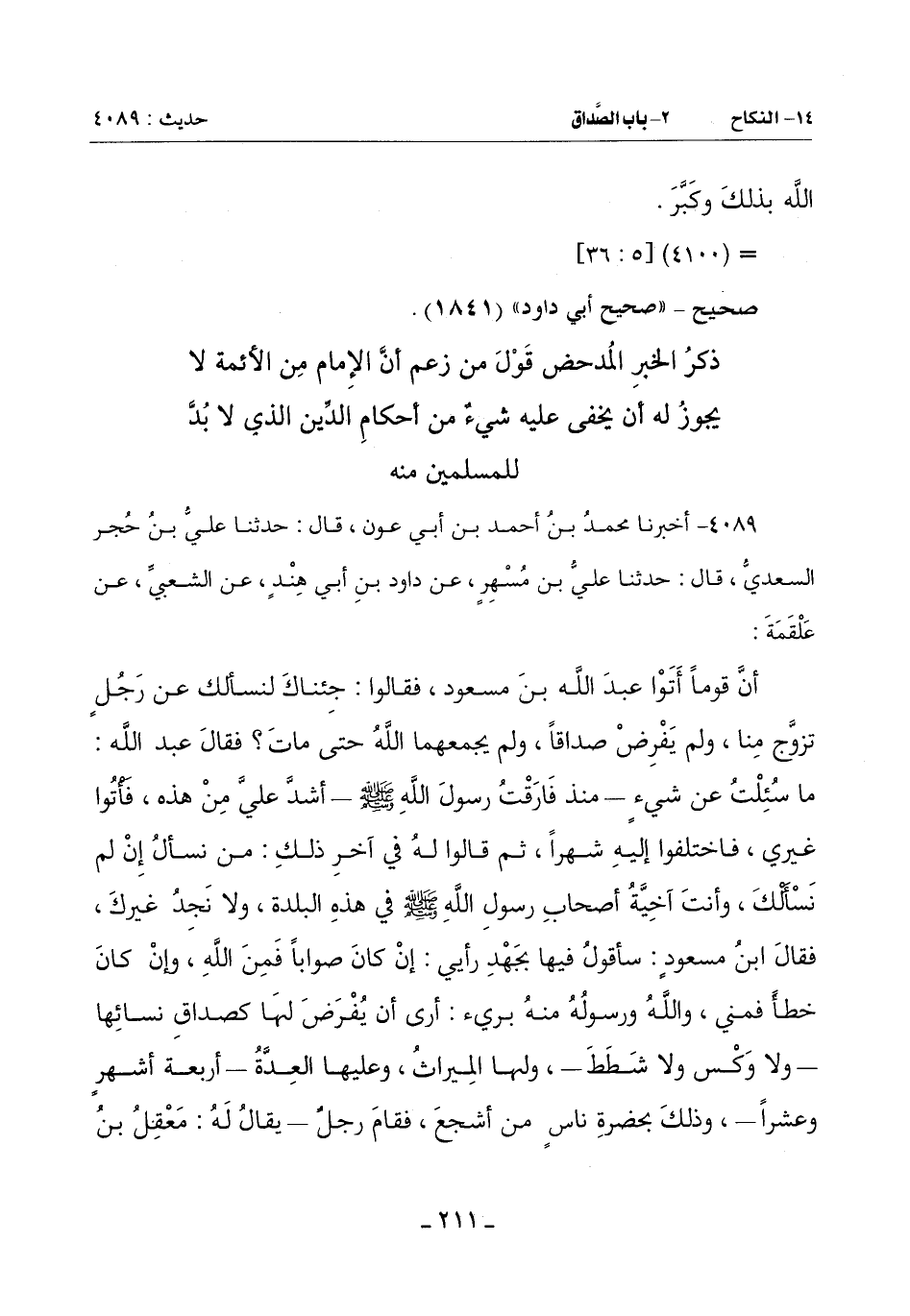 أَنَّ قَوْمًا أَتَوْا عَبْدَ اللَّهِ بْنَ مَسْعُودٍ فَقَالُوا: جِئْنَاكَ لِنَسْأَلَكَ عَنْ رَجُلٍ تَزَوَّجَ مِنَّا وَلَمْ يَفْرِضْ صَدَاقًا وَلَمْ يَجْمَعْهُمَا اللَّهُ حَتَّى مَاتَ فَقَالَ عَبْدُ اللَّهِ: مَا سُئِلْتُ عَنْ شيءٍ ـ مُنْذُ فَارَقْتُ رَسُولَ اللَّهِ صَلَّى اللَّهُ عَلَيْهِ وَسَلَّمَ ـ أشدَّ عَلَيَّ مِنْ هَذِهِ فَأْتُوا غَيْرِي فَاخْتَلَفُوا إِلَيْهِ شَهْرًا ثُمَّ قَالُوا لَهُ فِي آخِرِ ذَلِكَ: مَنْ نَسْأَلُ إِنْ لَمْ نَسْأَلْكَ وَأَنْتَ آخِيَّةُ أَصْحَابِ رَسُولِ اللَّهِ صَلَّى اللَّهُ عَلَيْهِ وَسَلَّمَ فِي هَذِهِ الْبَلْدَةِ وَلَا نَجْدُ غَيْرَكَ فَقَالَ ابْنُ مَسْعُودٍ: سَأَقُولُ فِيهَا بِجَهْدِ رَأْيِي: إِنْ كَانَ صَوَابًا فَمِنَ اللَّهِ وَإِنْ كَانَ خَطَأً فَمِنِّي وَاللَّهُ وَرَسُولُهُ مِنْهُ بَرِيءٌ أَرَى أَنْ يُفْرَضَ لَهَا كَصَدَاقِ نِسَائِهَا وَلَا وَكْسَ وَلَا شَطَطَ وَلَهَا الْمِيرَاثُ وَعَلَيْهَا الْعِدَّةُ أَرْبَعَةَ أَشْهُرٍ وَعَشْرًا وَذَلِكَ بِحَضْرَةِ نَاسٍ مِنْ أَشْجَعَ فَقَامَ رَجُلٌ ـ يُقَالُ لَهُ: مَعْقِلُ بْنُ -[212]- سِنَانٍ الْأَشْجَعِيُّ ـ فَقَالَ: (أَشْهَدُ أَنَّكَ قَضَيْتَ بِمِثْلِ الَّذِي قَضَى بِهِ رَسُولُ اللَّهِ صَلَّى اللَّهُ عَلَيْهِ وَسَلَّمَ فِي امرأةٍ مِنَّا ـ يُقَالُ لَهَا: بَرْوَعَ بِنْتُ وَاشِقٍ ـ فَمَا رُئِيَ عَبْدُ اللَّهِ فَرِحَ بِشَيْءٍ ـ بَعْدَ الْإِسْلَامِ ـ كَفَرْحِهِ بِهَذِهِ الْقِصَّةِ