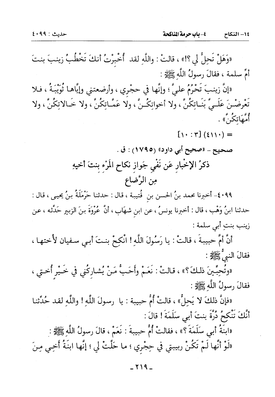 4099 - أَخْبَرَنَا مُحَمَّدُ بْنُ الْحَسَنِ بْنِ قُتَيْبَةَ قَالَ: حَدَّثَنَا حَرْمَلَةُ بْنُ يَحْيَى قَالَ: حَدَّثَنَا ابْنُ وَهْبٍ قَالَ: أَخْبَرَنَا يُونُسُ عَنِ ابْنِ شِهَابٍ أَنَّ عُرْوَةَ بْنَ الزُّبَيْرِ حَدَّثَهُ عَنْ زَيْنَبَ بِنْتِ أَبِي سَلَمَةَ