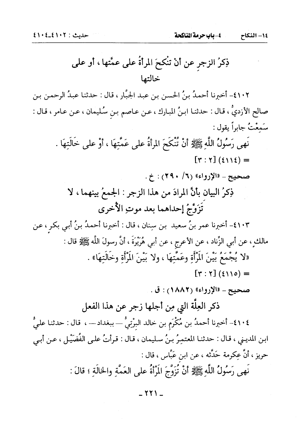 نَهَى رَسُولُ اللَّهِ صَلَّى اللَّهُ عَلَيْهِ وَسَلَّمَ أَنْ تُزَوَّجَ الْمَرْأَةُ عَلَى الْعَمَّةِ وَالْخَالَةِ قَالَ: -[222]-