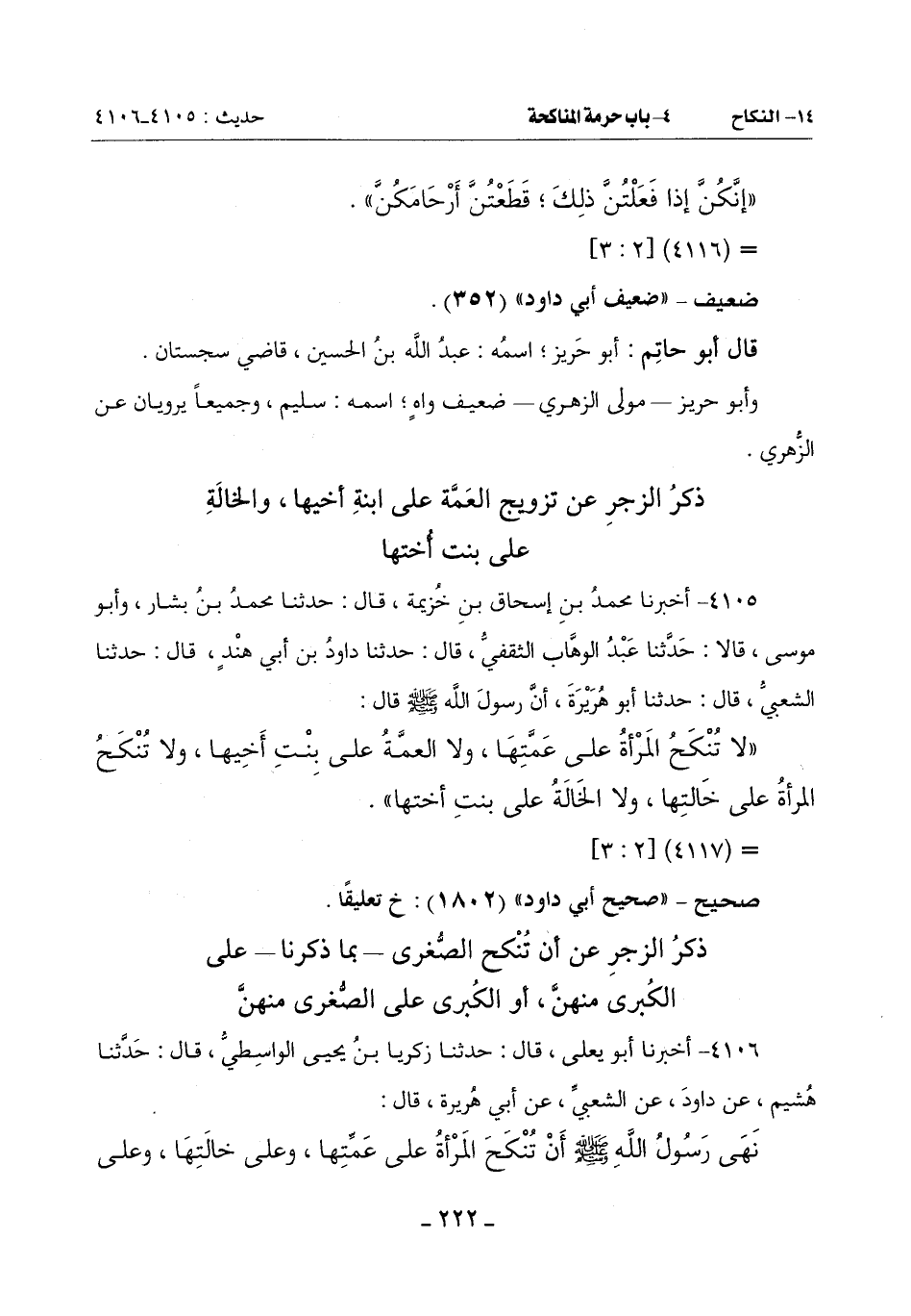 (لَا تُنْكَحُ الْمَرْأَةُ عَلَى عَمَّتِهَا وَلَا الْعَمَّةُ عَلَى بِنْتِ أَخِيهَا وَلَا تُنْكَحُ الْمَرْأَةُ عَلَى خَالَتِهَا وَلَا الْخَالَةُ على بنت أختها)