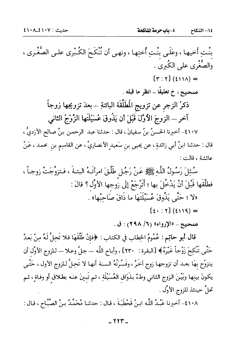 قال أبو حاتم: عموم الخطاب في الكتاب {فإن طلقها فلا تحل له من بعد حَتَّى تَنْكِحَ زَوْجًا غَيْرَهُ} [البقرة: 230] وَأَبَاحَ اللَّهُ جَلَّ وَعَلَا لِلزَّوْجِ الْأَوَّلِ أَنْ يَتَزَوَّجَ بِهَا بَعْدَ أَنْ تَزَوَّجَهَا زَوْجٌ آخَرَ وَفَسَّرَتْهُ السُّنَّةُ أَنَّهَا لَا تَحِلُّ لِلزَّوْجِ الْأَوَّلِ حَتَّى يَكُونَ بَيْنَهَا وَبَيْنَ الزَّوْجِ الثَّانِي وَطْءٌ بِذَوَاقِ الْعُسَيْلَةِ ثُمَّ تَبِينَ عَنْهُ بِطَلَاقٍ أَوْ وَفَاةٍ ثُمَّ تَحِلُّ حِينَئِذٍ لِلزَّوْجِ الْأَوَّلِ