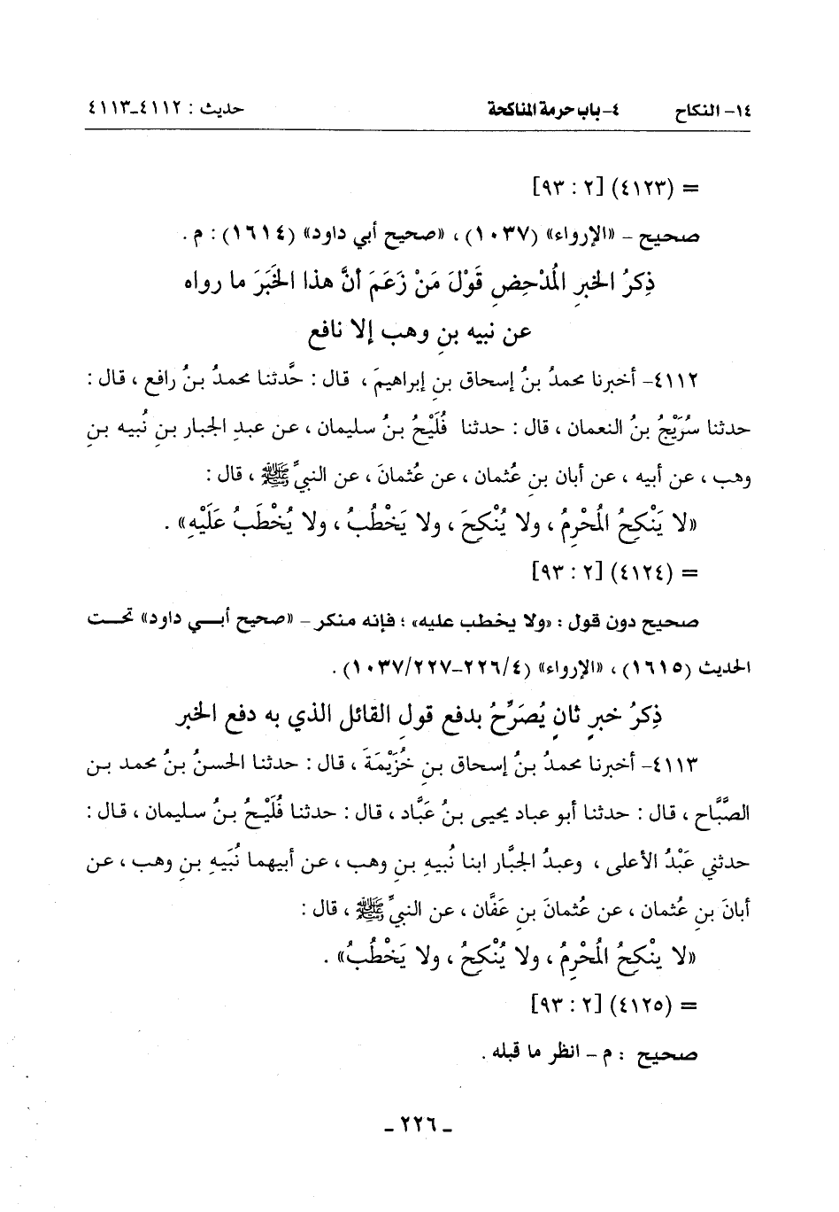 4113 - أَخْبَرَنَا مُحَمَّدُ بْنُ إِسْحَاقَ بْنِ خُزَيْمَةَ قَالَ: حَدَّثَنَا الْحَسَنُ بْنُ مُحَمَّدِ بْنِ الصَّبَّاحِ قَالَ: حَدَّثَنَا أَبُو عَبَّادٍ يَحْيَى بْنُ عَبَّادٍ قَالَ: حَدَّثَنَا فُلَيْحُ بْنُ سُلَيْمَانَ قَالَ: حَدَّثَنِي عَبْدُ الْأَعْلَى وَعَبْدُ الْجَبَّارِ ابْنَا نُبَيْهِ بْنُ وَهْبٍ عَنْ أَبِيهِمَا نُبَيْهِ بْنِ وَهْبٍ عَنْ أَبَانَ بْنِ عُثْمَانَ عَنْ عُثْمَانَ بْنِ عَفَّانَ عَنِ النَّبِيِّ صَلَّى اللَّهُ عَلَيْهِ وَسَلَّمَ قَالَ: