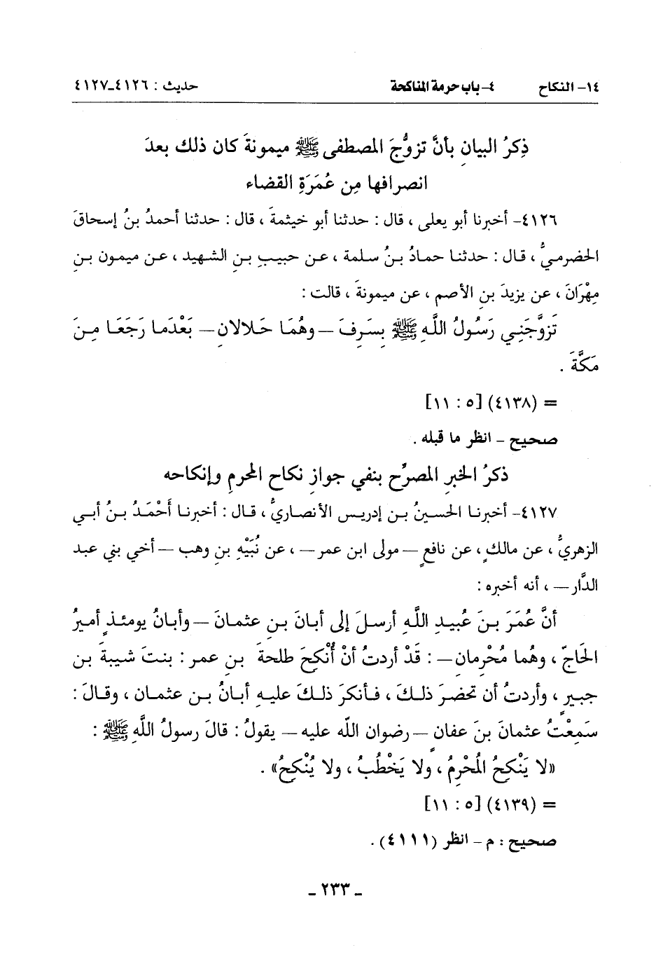 قَالَ أَبُو حَاتِمٍ ـ رَضِيَ اللَّهُ عَنْهُ ـ: هَذَانِ خَبَرَانِ فِي نِكَاحِ الْمُصْطَفَى صَلَّى اللَّهُ عَلَيْهِ وَسَلَّمَ مَيْمُونَةَ تَضَادَا فِي الظَّاهِرِ وَعَوَّلَ أَئِمَّتُنَا فِي الْفَصْلِ فِيهِمَا بِأَنْ قَالُوا: إِنَّ خَبَرَ ابْنِ عَبَّاسٍ أَنَّ النَّبِيَّ صَلَّى اللَّهُ عَلَيْهِ وَسَلَّمَ تَزَوَّجَ مَيْمُونَةَ وَهُوَ مُحْرِمٌ ..... وَهُمْ كَذَلِكَ قَالَهُ سَعِيدُ بْنُ الْمُسَيِّبِ وَخَبَرُ يَزِيدَ بْنِ الْأَصَمِّ يُوَافِقُ خَبَرَ عُثْمَانَ بْنِ عَفَّانَ رِضْوَانُ اللَّهِ عَلَيْهِ فِي النَّهْيِ عَنْ نِكَاحِ الْمُحْرِمِ وَإِنْكَاحِهِ وَهُوَ أَوْلَى بِالْقَبُولِ لِتَأْيِيدِ خَبَرِ عُثْمَانَ إِيَّاهُ.