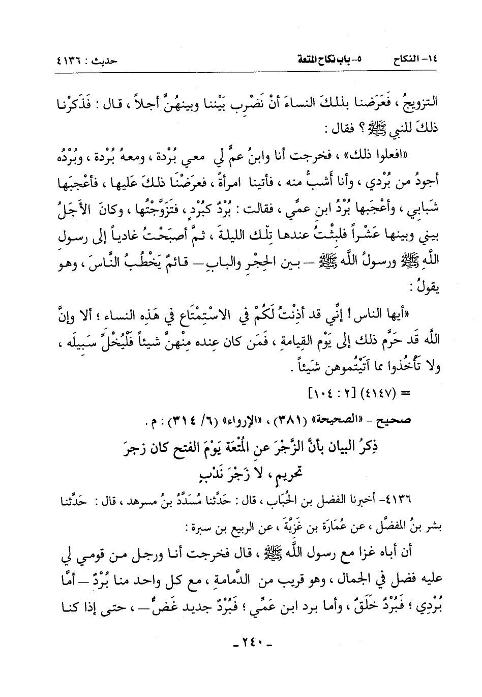 أَنَّ أَبَاهُ غَزَا مَعَ رَسُولِ اللَّهِ صَلَّى اللَّهُ عَلَيْهِ وَسَلَّمَ قَالَ: فَخَرَجْتُ أَنَا وَرَجُلٌ مِنْ قَوْمِي لِي عَلَيْهِ فَضْلٌ فِي الْجَمَالِ وَهُوَ قَرِيبٌ مِنَ الدَّمامة مَعَ كُلِّ وَاحِدٍ مِنَّا بُرْدٌ ـ أَمَا بُرْدِي فَبُرْدٌ خَلَقٌ وَأَمَّا بُرْدُ ابْنِ عَمِّي فَبُرْدٌ جَدِيدٌ غَضٌّ ـ حَتَّى إِذَا كُنَّا -[241]- أَسْفَلَ مَكَّةَ أَوْ بِأَعْلَاهَا فلقينا فتاة مثل البكرة فقلنا: ها نَسْتَمْتِعُ مِنْكِ؟ قَالَتْ: وَمَاذَا تَبْذُلَانِ فَنَشَرَ كُلُّ واحد بُرْدَهُ فَجَعَلَتْ تَنْظُرُ إِلَى الرَّجُلِ فَإِذَا رَآهَا الرَّجُلُ تَنْظُرُ إِلَيَّ عِطْفِهَا وَقَالَ: بُرْدٌ هَذَا خلقٌ وَبُرْدِي جَدِيدٌ غَضٌّ فَتَقُولُ: بُرْدُ هَذَا لَا بَأْسَ بِهِ ثُمَّ اسْتَمْتَعْتُ مِنْهَا فَلَمْ نَخْرُجْ حَتَّى حرَّمها رَسُولُ اللَّهِ صَلَّى اللَّهُ عليه وسلم