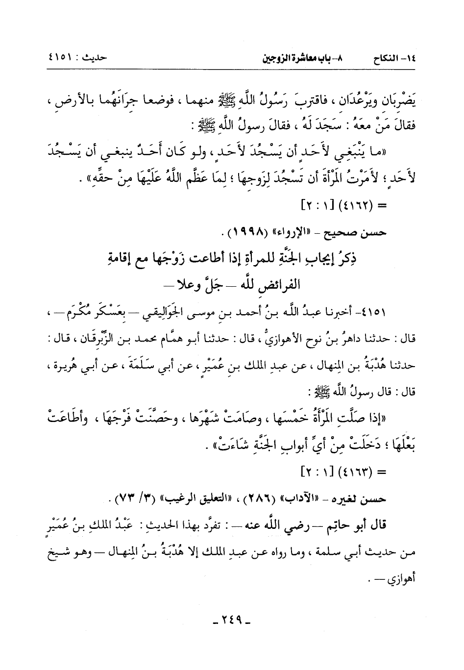 4151 - أَخْبَرَنَا عَبْدُ اللَّهِ بْنُ أَحْمَدَ بْنِ مُوسَى الْجَوَالِيقِيُّ بِعَسْكَرِ مُكْرَمٍ قَالَ: حَدَّثَنَا دَاهِرُ بْنُ نُوحٍ الْأَهْوَازِيُّ قَالَ: حَدَّثَنَا أَبُو هَمَّامٍ مُحَمَّدُ بْنُ الزِّبْرِقَانِ قَالَ: حَدَّثَنَا هُدْبَةُ بْنُ الْمِنْهَالِ عَنْ عَبْدِ الْمَلِكِ بْنِ عُمَيْرٍ عَنْ أَبِي سَلَمَةَ عَنْ أَبِي هُرَيْرَةَ قَالَ: قَالَ رَسُولُ اللَّهِ صَلَّى اللَّهُ عَلَيْهِ وَسَلَّمَ: