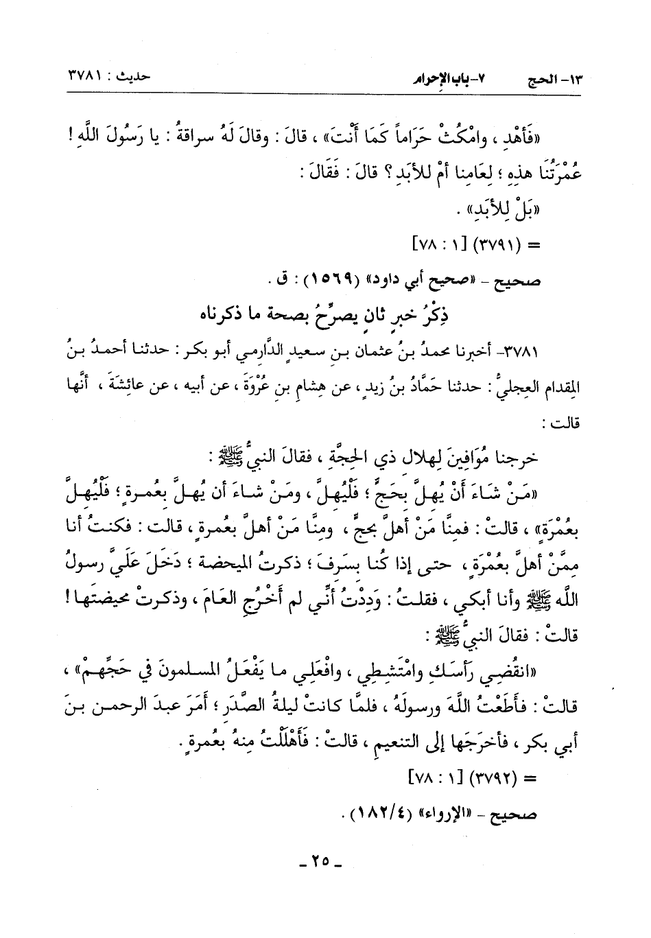 3781 - أَخْبَرَنَا مُحَمَّدُ بْنُ عُثْمَانَ بْنِ سَعِيدٍ الدَّارِمِيُّ أَبُو بَكْرٍ حَدَّثَنَا أَحْمَدُ بْنُ الْمِقْدَامِ الْعِجْلِيُّ حَدَّثَنَا حَمَّادُ بْنُ زَيْدٍ عَنْ هِشَامِ بْنِ عُرْوَةَ عَنْ أَبِيهِ: عَنْ عَائِشَةَ أَنَّهَا قَالَتْ: