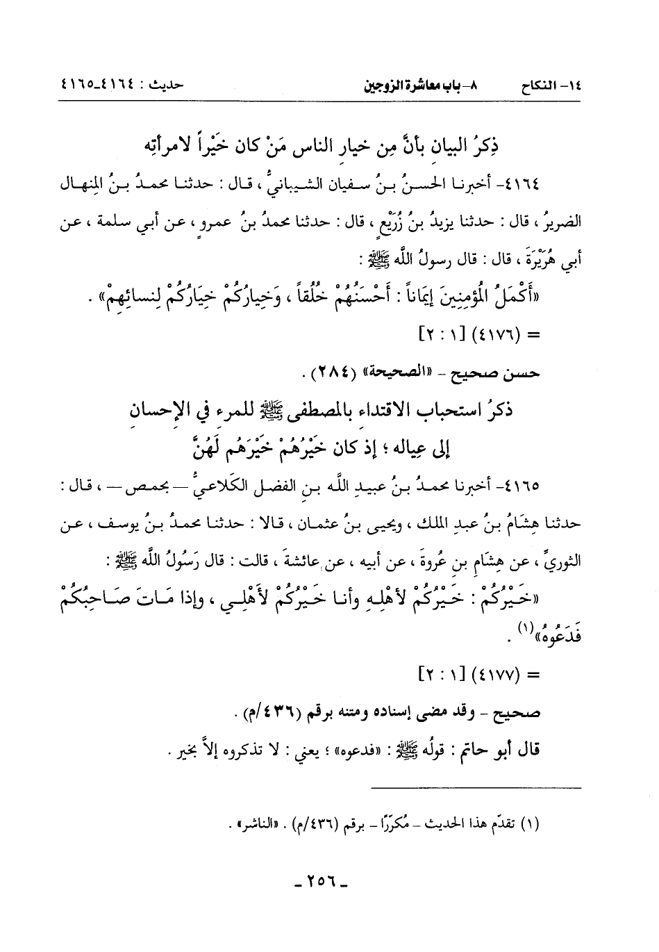 (خَيْرُكُمْ خَيْرَكُمْ لِأَهْلِهِ وَأَنَا خَيْرُكُمْ لِأَهْلِي وَإِذَا مَاتَ صاحبكم فدعوه) (¬1)