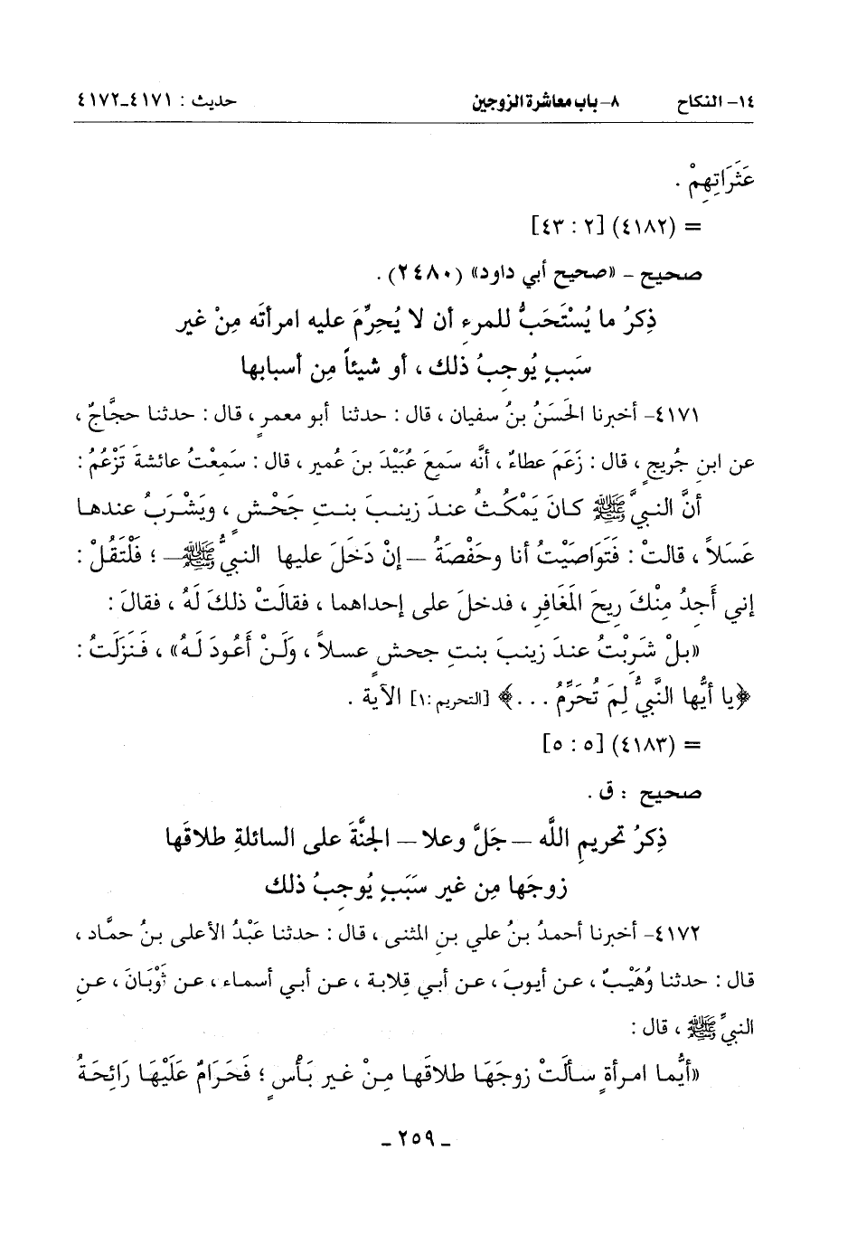 ذِكْرُ مَا يُسْتَحَبُّ لِلْمَرْءِ أَنْ لَا يحرِّم عَلَيْهِ امْرَأَتَهُ مِنْ غَيْرِ سَبَبٍ يُوجِبُ ذَلِكَ أَوْ شَيْئًا مِنْ أَسْبَابِهَا