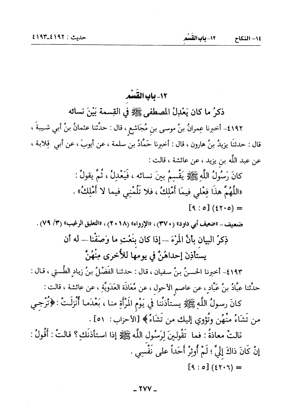 4192 - أَخْبَرَنَا عِمْرَانُ بْنُ مُوسَى بْنِ مُجَاشِعٍ قَالَ: حَدَّثَنَا عُثْمَانُ بْنُ أَبِي شَيْبَةَ قَالَ: حَدَّثَنَا يَزِيدُ بْنُ هَارُونَ قَالَ: أَخْبَرَنَا حَمَّادُ بْنُ سَلَمَةَ عَنْ أَيُّوبَ عَنْ أَبِي قِلَابَةَ عَنْ عَبْدِ اللَّهِ بْنِ يَزِيدَ عَنْ عَائِشَةَ قَالَتْ: