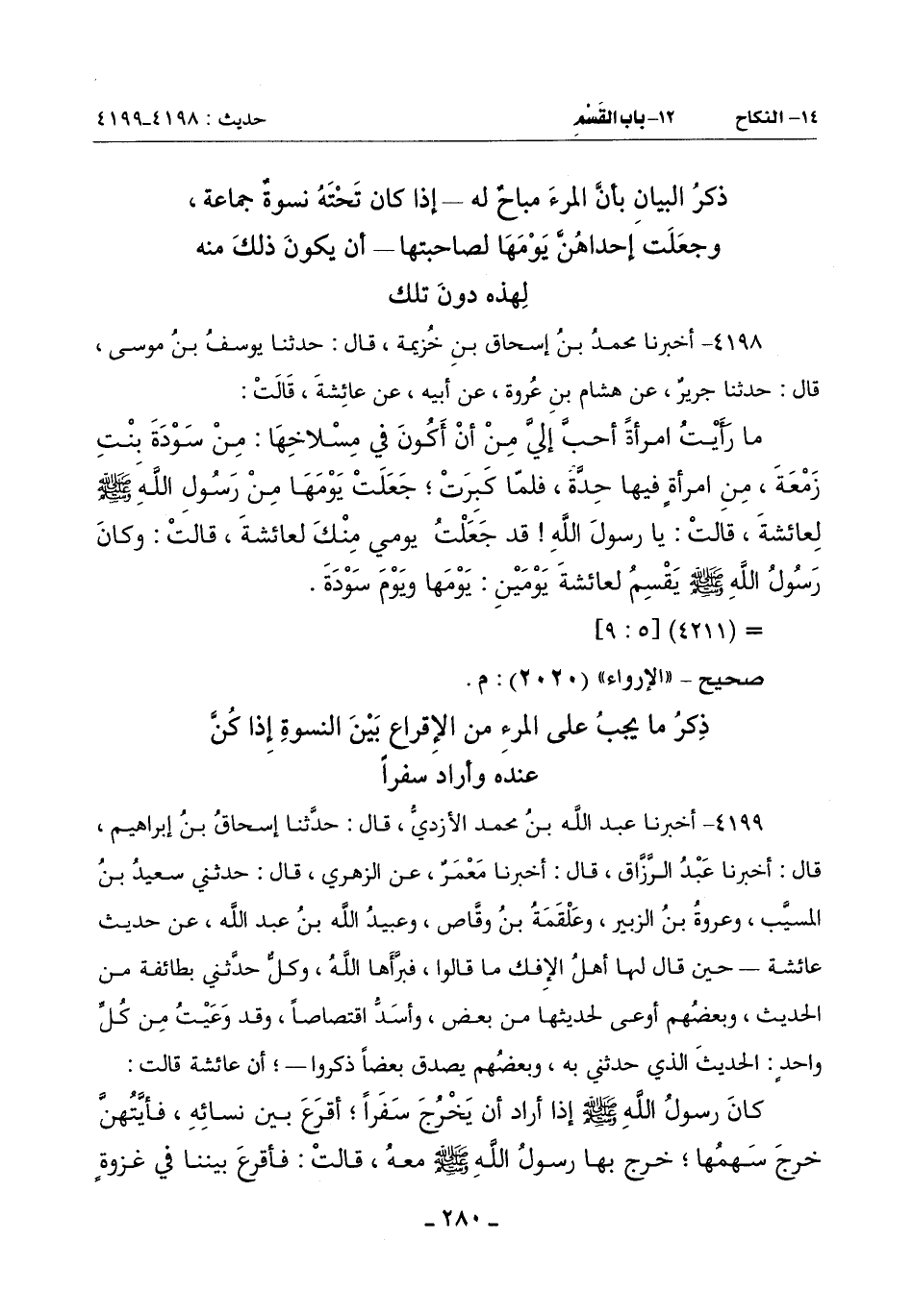 4198 - أَخْبَرَنَا مُحَمَّدُ بْنُ إِسْحَاقَ بْنِ خُزَيْمَةَ قَالَ: حَدَّثَنَا يُوسُفُ بْنُ مُوسَى قَالَ: حَدَّثَنَا جَرِيرٌ عَنْ هِشَامِ بْنِ عُرْوَةَ عَنْ أَبِيهِ عَنْ عَائِشَةَ قَالَتْ: