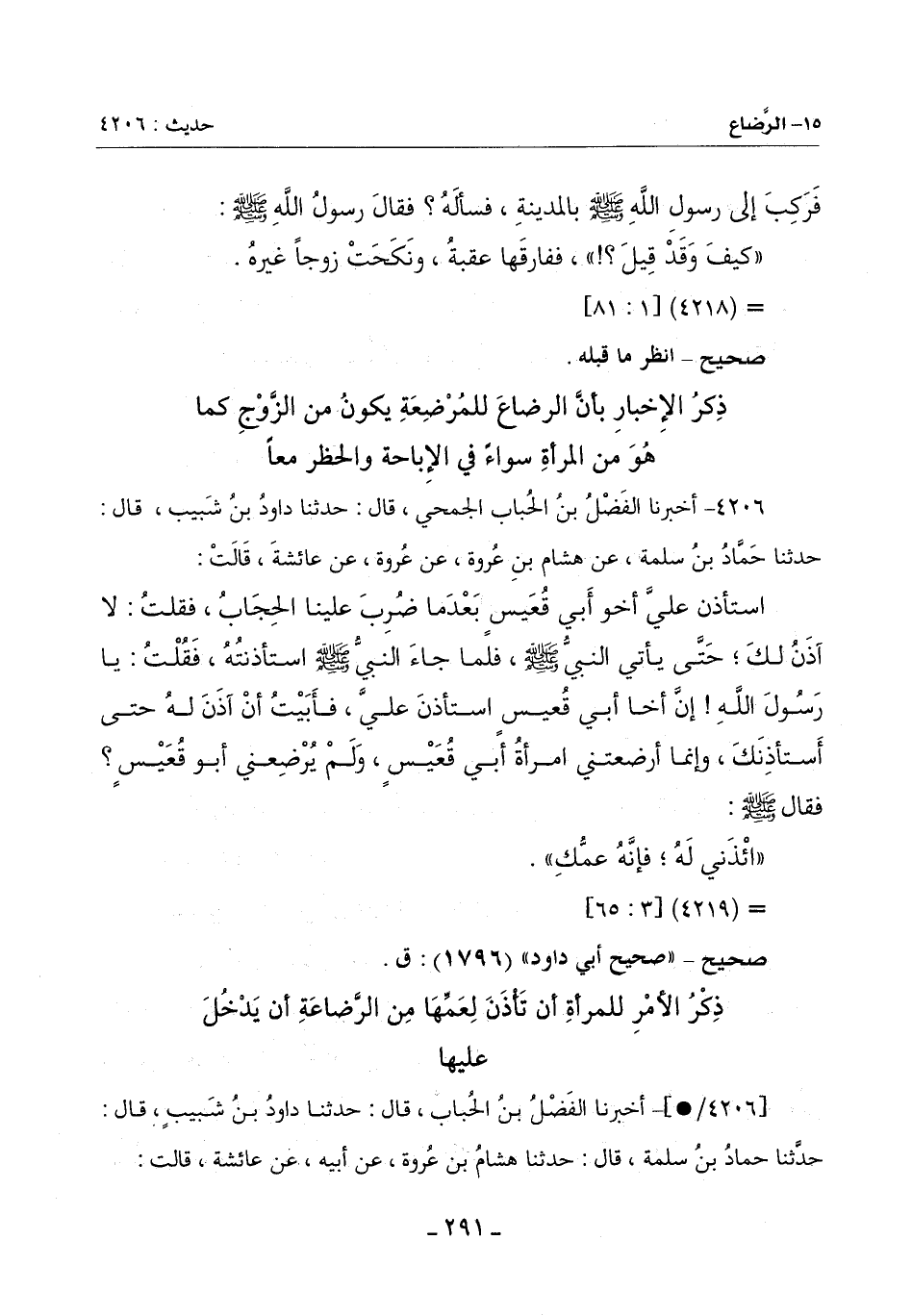 [4206/*]- أَخْبَرَنَا الْفَضْلُ بْنُ الْحُبَابِ قَالَ: حَدَّثَنَا دَاوُدُ بْنُ شَبِيبٍ قَالَ: حَدَّثَنَا حَمَّادُ بْنُ سَلَمَةَ قَالَ: حَدَّثَنَا هِشَامُ بْنُ عُرْوَةَ عَنْ أَبِيهِ عَنْ عَائِشَةَ قَالَتِ: -[292]-
