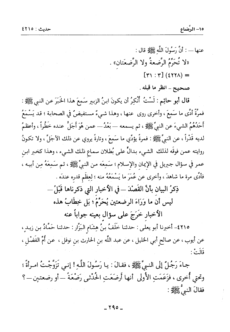 جَاءَ رَجُلٌ إِلَى النَّبِيِّ صَلَّى اللَّهُ عَلَيْهِ وَسَلَّمَ فَقَالَ: يَا رَسُولَ اللَّهِ إِنِّي تَزَوَّجْتُ امْرَأَةً وَتَحْتِي أُخْرَى فَزَعَمَتِ الْأُولَى أَنَّهَا أَرْضَعَتِ الحُدثى رَضْعَةً ـ أَوْ رَضْعَتَيْنِ ـ فَقَالَ النَّبِيُّ صَلَّى اللَّهُ عَلَيْهِ وَسَلَّمَ: -[296]-