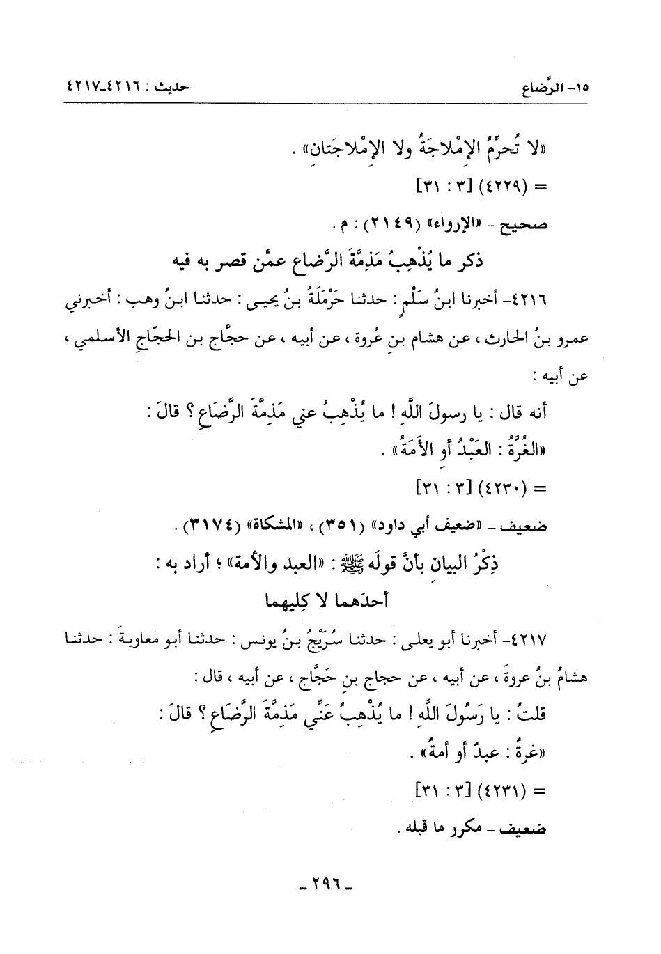 4216 - أَخْبَرَنَا ابْنُ سَلْمٍ حَدَّثَنَا حَرْمَلَةُ بْنُ يَحْيَى حَدَّثَنَا ابْنُ وَهْبٍ أَخْبَرَنِي عَمْرُو بْنُ الْحَارِثِ عَنْ هِشَامِ بْنِ عُرْوَةَ عَنْ أَبِيهِ عَنْ حجاج بن الججاج الْأَسْلَمِيِّ عَنْ أَبِيهِ: