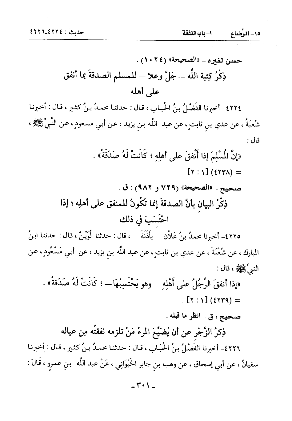 4224 - أَخْبَرَنَا الْفَضْلُ بْنُ الْحُبَابِ قَالَ: حَدَّثَنَا مُحَمَّدُ بْنُ كَثِيرٍ قَالَ: أَخْبَرَنَا شُعْبَةُ عَنْ عَدِيِّ بْنِ ثَابِتٍ عَنْ عَبْدِ اللَّهِ بْنِ يَزِيدَ عَنْ أَبِي مَسْعُودٍ عَنِ النَّبِيِّ صَلَّى اللَّهُ عَلَيْهِ وَسَلَّمَ قَالَ: