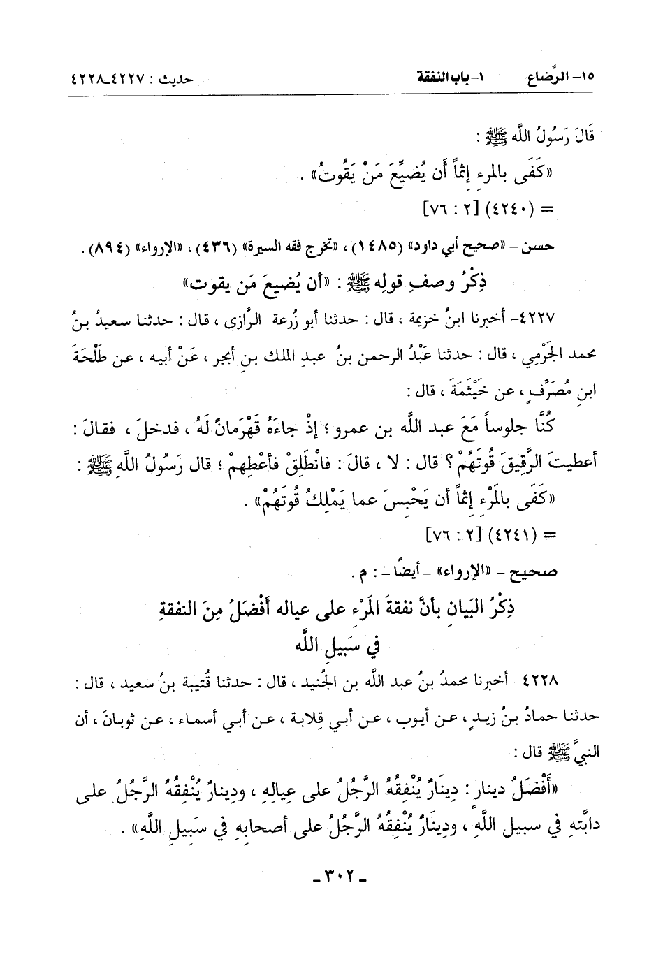 (أَفْضَلُ دينارٍ: دينارٌ يُنْفِقُهُ الرَّجُلُ عَلَى عِيَالِهِ وَدِينَارٌ يُنْفِقُهُ الرَّجُلُ عَلَى دَابَّتِهِ فِي سَبِيلِ اللَّهِ وَدِينَارٌ يُنْفِقُهُ الرَّجُلُ عَلَى أَصْحَابِهِ فِي سَبِيلِ اللَّهِ) -[303]-