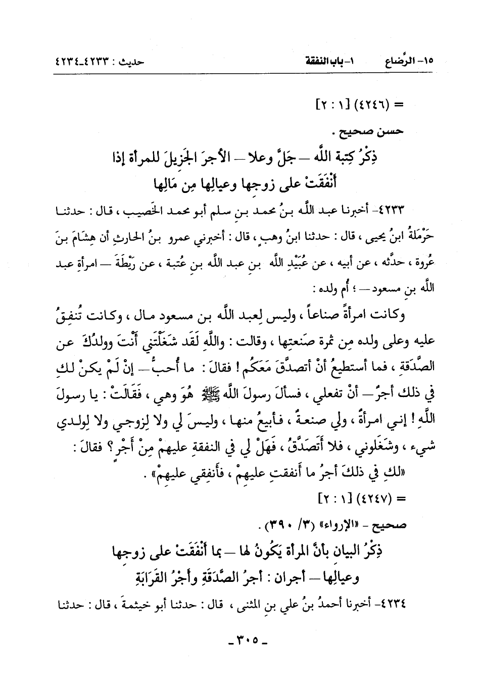 4233 - أَخْبَرَنَا عَبْدُ اللَّهِ بْنُ مُحَمَّدِ بْنِ سَلْمٍ أَبُو مُحَمَّدٍ الْخَصِيبُ قَالَ: حَدَّثَنَا حَرْمَلَةُ بْنُ يَحْيَى قَالَ: حَدَّثَنَا ابْنُ وَهْبٍ قَالَ: أَخْبَرَنِي عَمْرُو بْنُ الْحَارِثِ أَنَّ هِشَامَ بْنَ عُرْوَةَ حَدَّثَهُ عَنْ أَبِيهِ عَنْ عُبَيْدِ اللَّهِ بْنِ عَبْدِ اللَّهِ بْنِ عُتْبَةَ عَنْ رَيْطَةَ ـ امْرَأَةِ عَبْدِ اللَّهِ بْنِ مَسْعُودٍ ـ أُمِّ وَلَدِهِ: