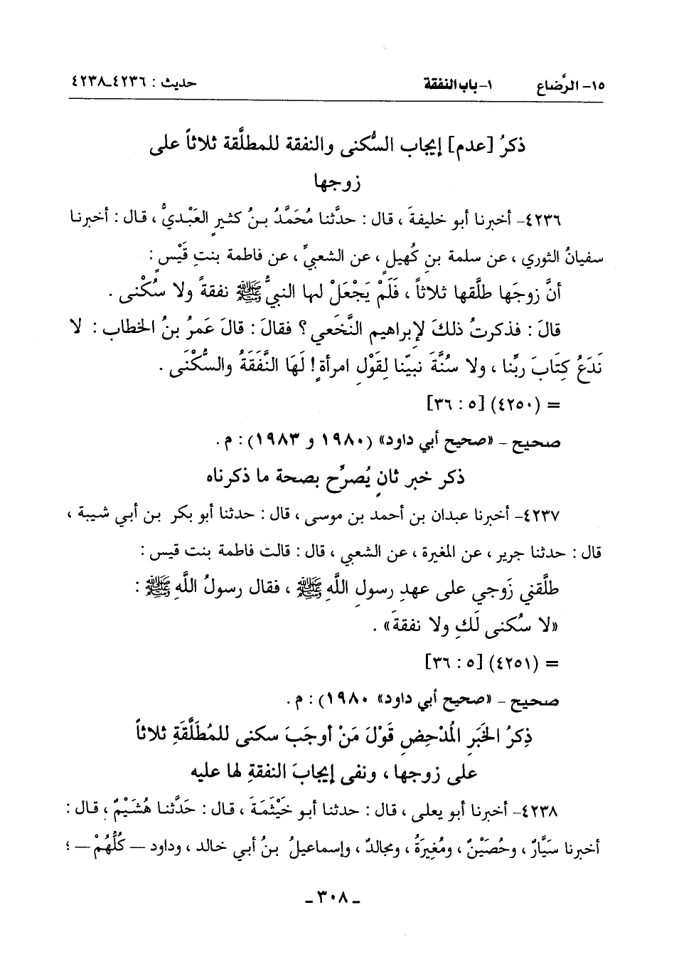 4236 - أَخْبَرَنَا أَبُو خَلِيفَةَ قَالَ: حَدَّثَنَا مُحَمَّدُ بْنُ كثير العبدي قال: أَخْبَرَنَا سُفْيَانُ الثَّوْرِيُّ عَنْ سَلَمَةَ بْنِ كُهَيْلٍ عَنِ الشَّعْبِيِّ عَنْ فَاطِمَةَ بِنْتِ قَيْسٍ: