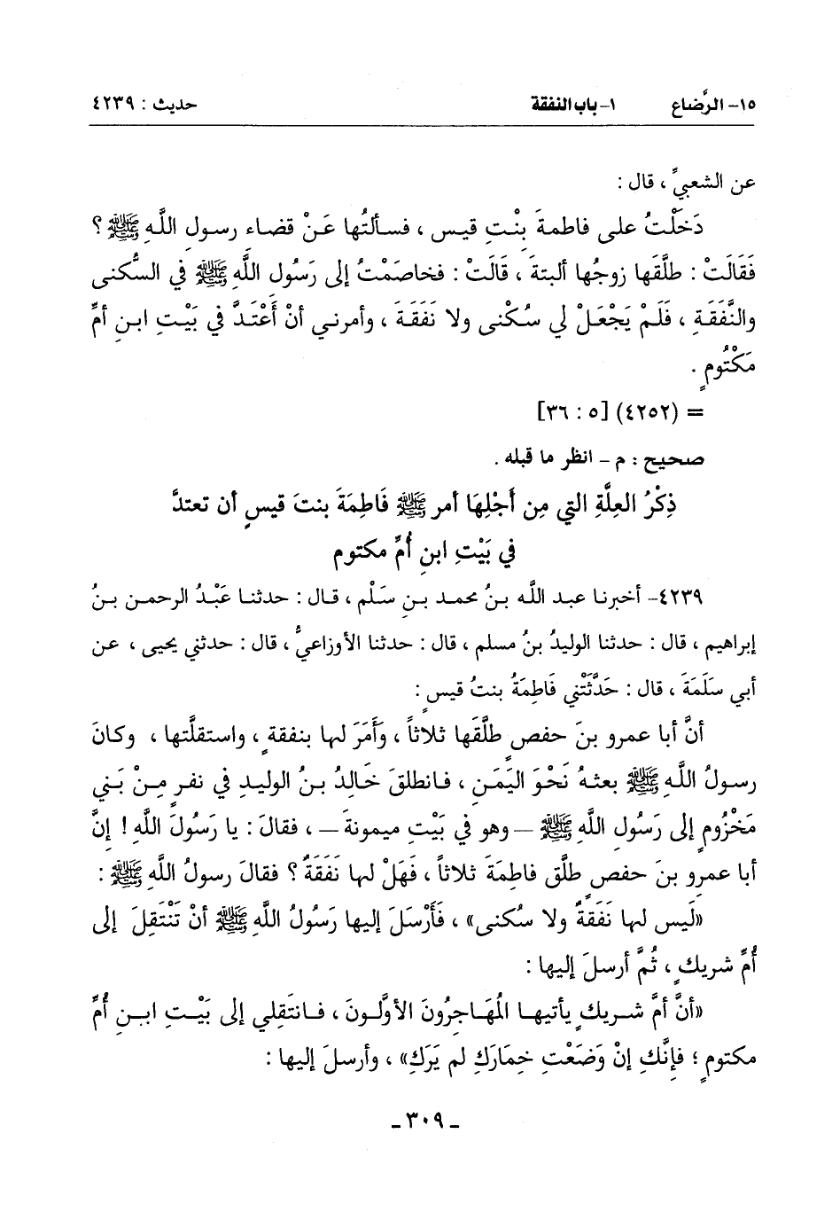 4239 - أَخْبَرَنَا عَبْدُ اللَّهِ بْنُ مُحَمَّدِ بْنِ سَلْمٍ قَالَ: حَدَّثَنَا عَبْدُ الرَّحْمَنِ بْنُ إِبْرَاهِيمَ قَالَ: حَدَّثَنَا الْوَلِيدُ بْنُ مُسْلِمٍ قَالَ: حَدَّثَنَا الْأَوْزَاعِيُّ قَالَ: حَدَّثَنِي يَحْيَى عَنْ أَبِي سَلَمَةَ قَالَ: حدثتني فاطمة بنت قيس: