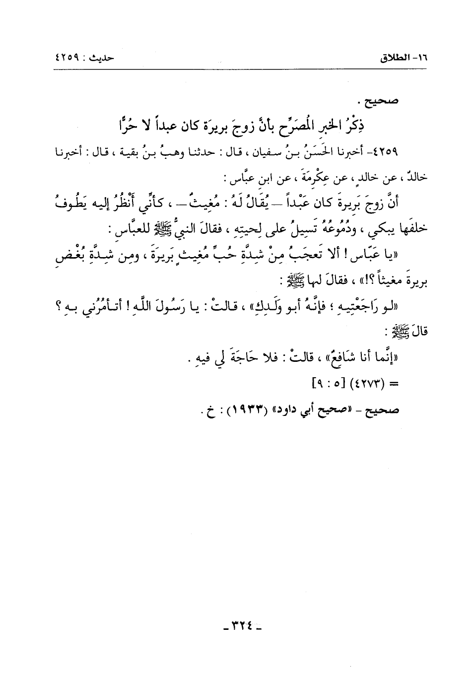 أَنَّ زَوْجَ بَرِيرَةَ كَانَ عَبْدًا ـ يُقَالُ لَهُ: مُغِيثٌ ـ كَأَنِّي أَنْظُرُ إِلَيْهِ يَطُوفُ خَلْفَهَا يَبْكِي وَدُمُوعُهُ تَسِيلُ عَلَى لِحْيَتِهِ فَقَالَ النَّبِيُّ صَلَّى اللَّهُ عَلَيْهِ وَسَلَّمَ لِلْعَبَّاسِ: