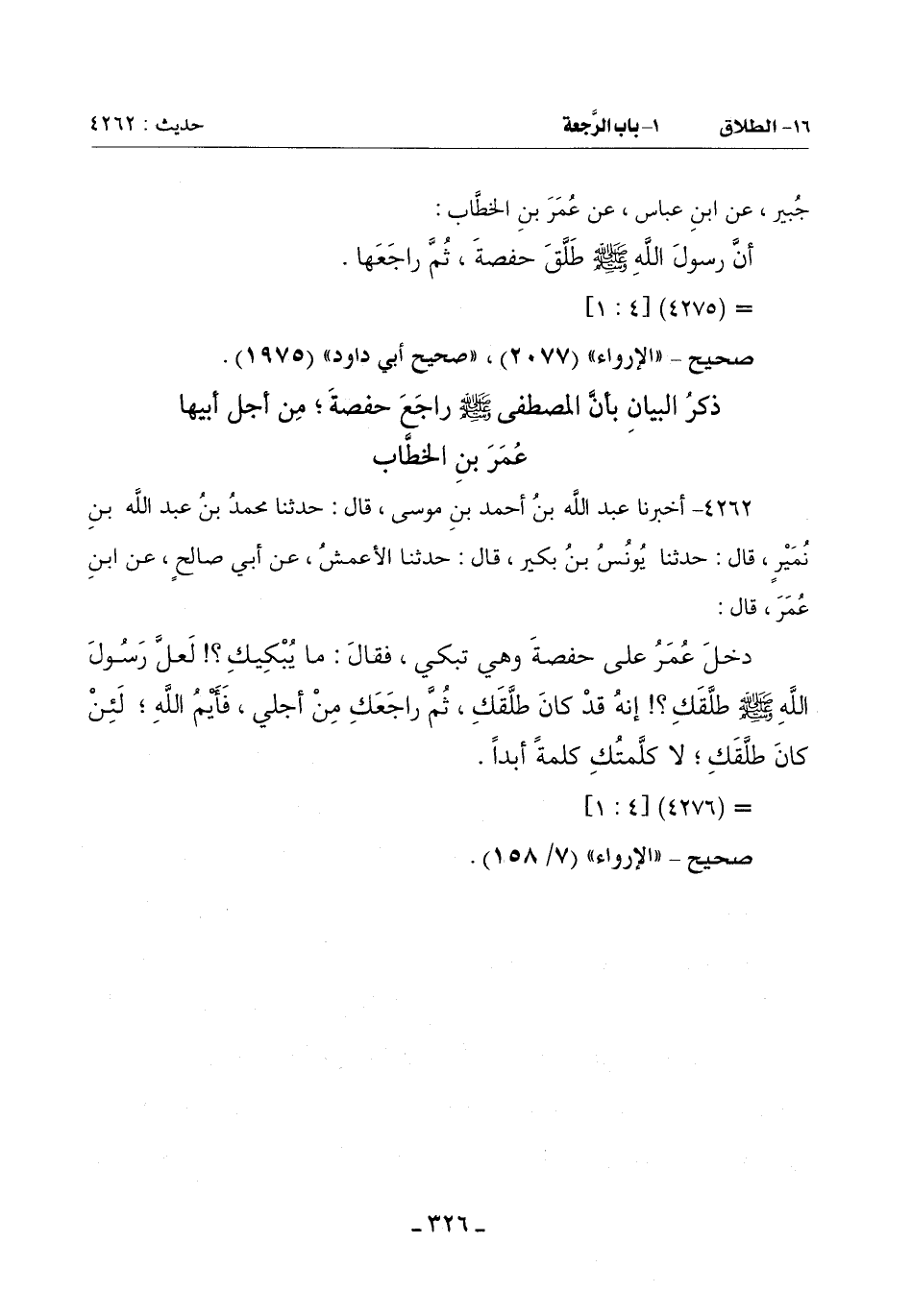 ذِكْرُ الْبَيَانِ بِأَنَّ الْمُصْطَفَى صَلَّى اللَّهُ عَلَيْهِ وَسَلَّمَ رَاجِعْ حَفْصَةَ مِنْ أَجْلِ أَبِيهَا عُمَرَ بن الخطاب