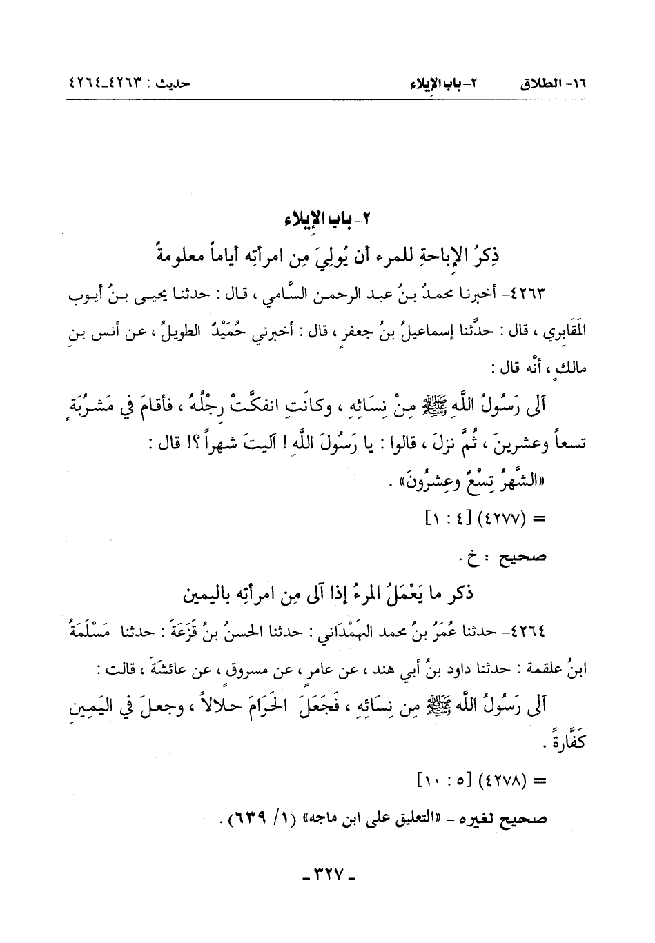 آلَى رَسُولُ اللَّهِ صَلَّى اللَّهُ عَلَيْهِ وَسَلَّمَ مِنْ نِسَائِهِ وَكَانَتِ انفكَّت رِجْلُهُ فَأَقَامَ فِي مَشْرُبَةٍ تِسْعًا وَعِشْرِينَ ثُمَّ نَزَلَ قَالُوا: يَا رَسُولَ اللَّهِ آلَيْتَ شَهْرًا قَالَ: