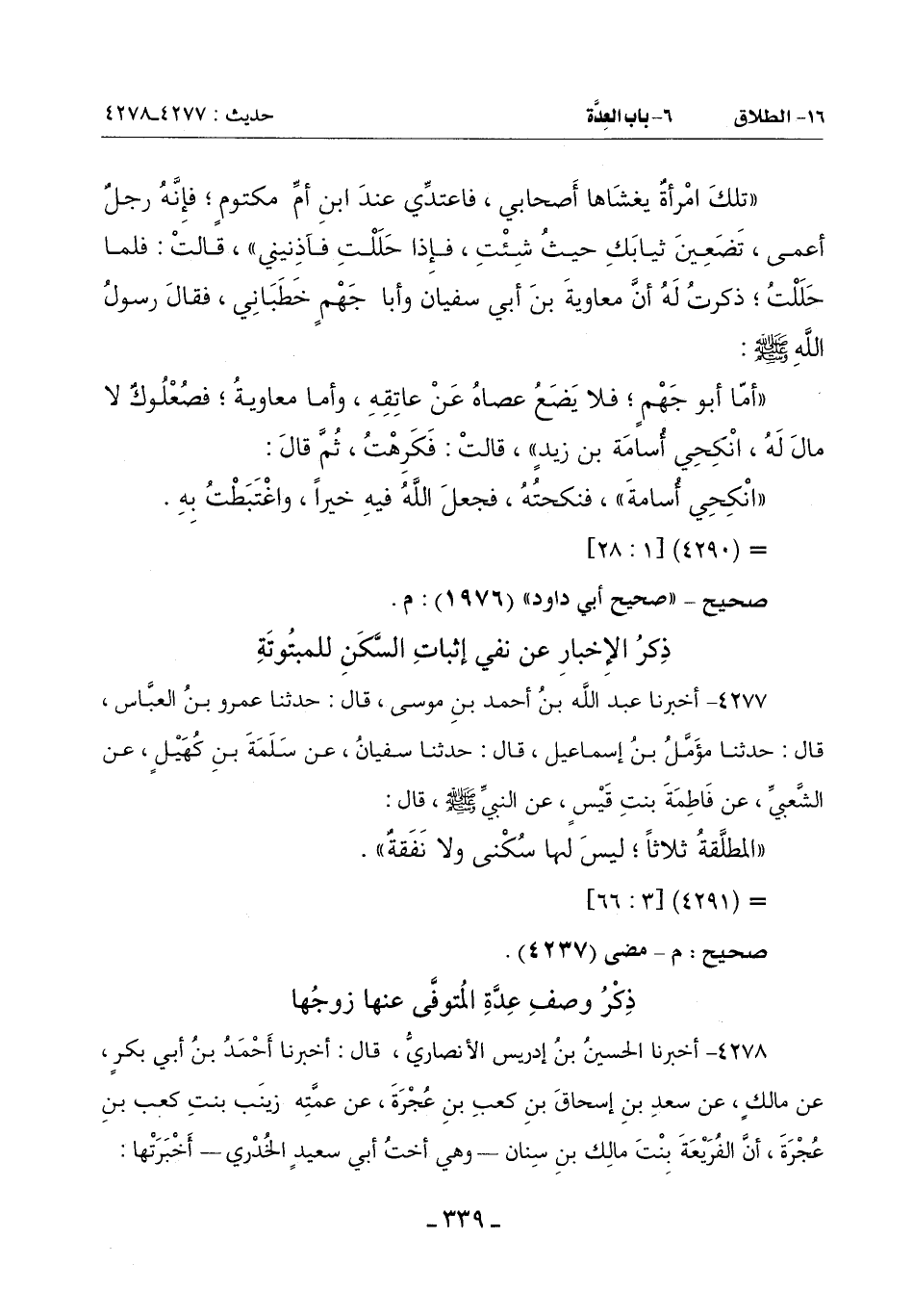 4278 - أَخْبَرَنَا الْحُسَيْنُ بْنُ إِدْرِيسَ الْأَنْصَارِيُّ قَالَ: أَخْبَرَنَا أَحْمَدُ بْنُ أَبِي بَكْرٍ عَنْ مَالِكٍ عَنْ سَعْدِ بْنِ إِسْحَاقَ بْنِ كَعْبِ بْنِ عُجْرَةَ عَنْ عمَّتِه زَيْنَبَ بِنْتِ كَعْبِ بْنِ عُجْرَةَ أَنَّ الفُرَيْعَةَ بِنْتَ مَالِكِ بْنِ سِنَانَ ـ وَهِيَ أُخْتُ أَبِي سَعِيدٍ الْخُدْرِيِّ ـ أَخْبَرَتْهَا: -[340]-