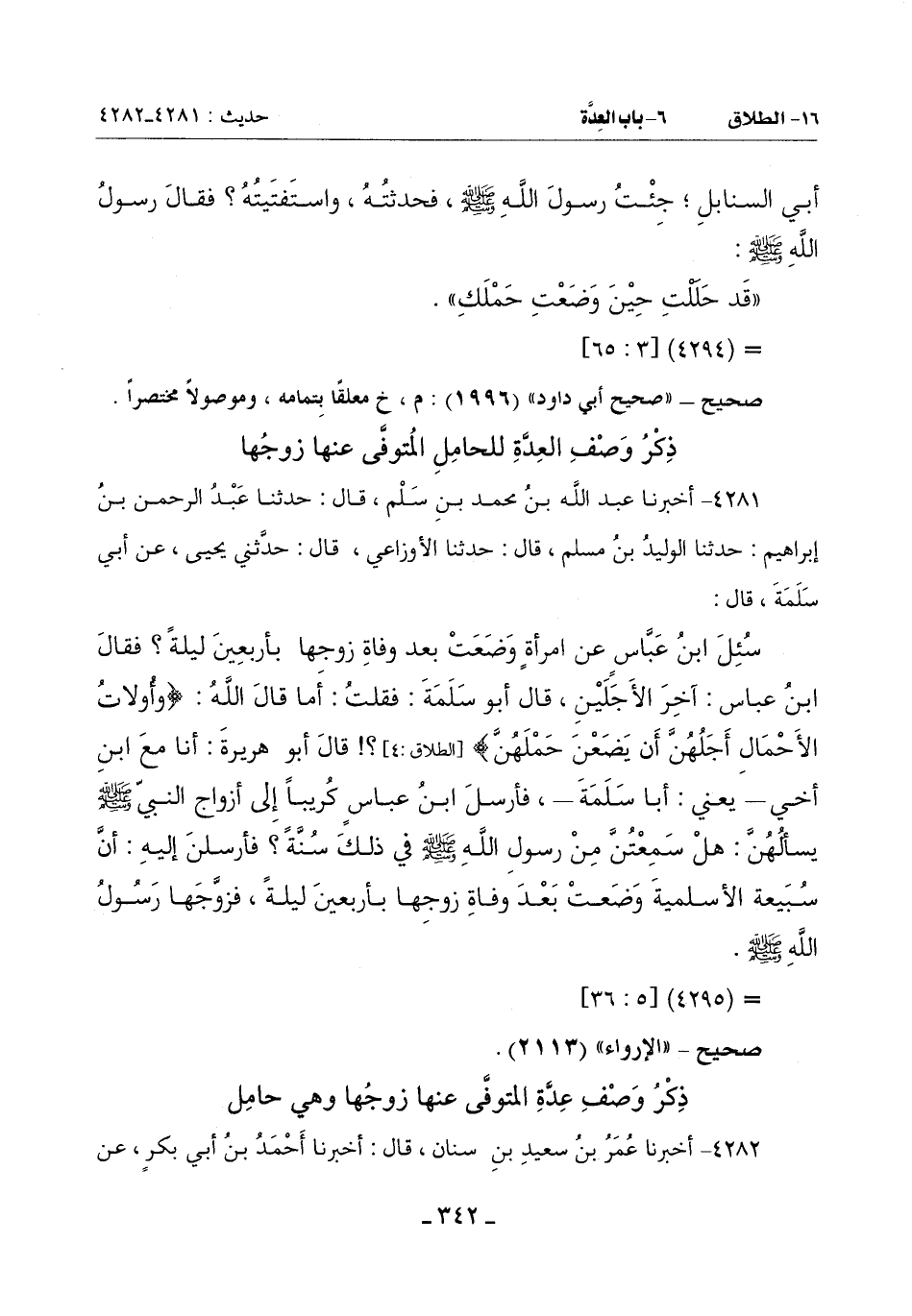 سُئِلَ ابْنُ عَبَّاسٍ عَنِ امْرَأَةٍ وَضَعَتْ بَعْدَ وَفَاةِ زَوْجِهَا بِأَرْبَعِينَ لَيْلَةً فَقَالَ ابْنُ عَبَّاسٍ: آخِرَ الْأَجَلَيْنِ قَالَ أَبُو سَلَمَةَ: فَقُلْتُ: أَمَا قَالَ اللَّهُ: {وَأُولَاتُ الْأَحْمَالِ أَجَلُهُنَّ أَنْ يَضَعْنَ حَمْلَهُنَّ} [الطلاق: 4]؟ قَالَ أَبُو هُرَيْرَةَ: أَنَا مَعَ ابْنِ أَخِي ـ يَعْنِي أَبَا سَلَمَةَ ـ فَأَرْسَلَ ابْنُ عَبَّاسٍ كُريباً إِلَى أَزْوَاجِ النَّبِيِّ صَلَّى اللَّهُ عَلَيْهِ وَسَلَّمَ يَسْأَلَهُنَّ: هَلْ سَمِعْتُنَّ مِنْ رَسُولِ اللَّهِ صَلَّى اللَّهُ عَلَيْهِ وَسَلَّمَ فِي ذَلِكَ سُنَّةً؟ فَأَرْسَلْنَ إِلَيْهِ: أَنَّ سُبَيعة الْأَسْلَمِيَّةَ وَضَعَتْ بَعْدَ وَفَاةِ زَوْجِهَا بِأَرْبَعِينَ لَيْلَةً فَزَوَّجَهَا رَسُولُ اللَّهِ صلى الله عليه وسلم